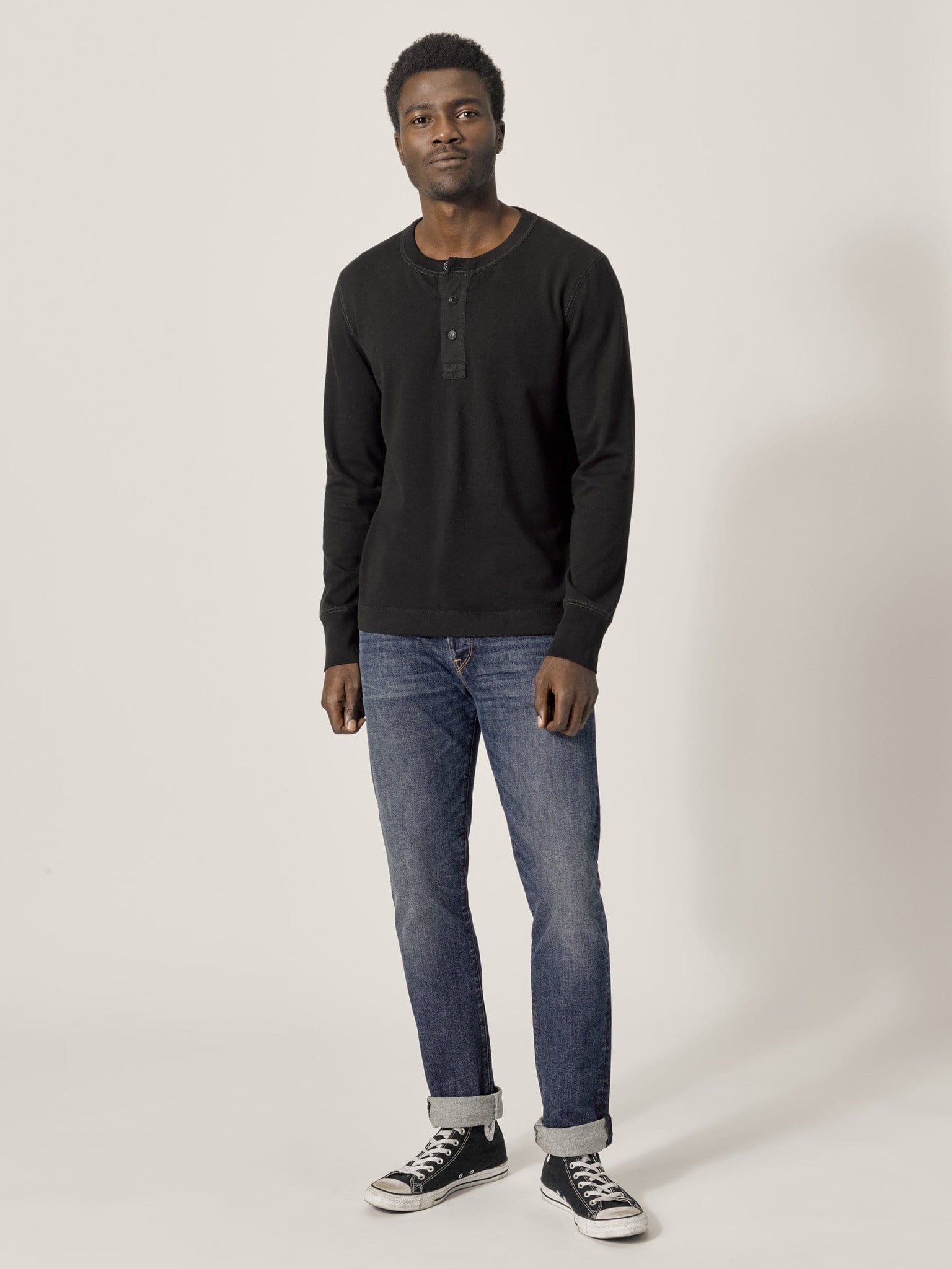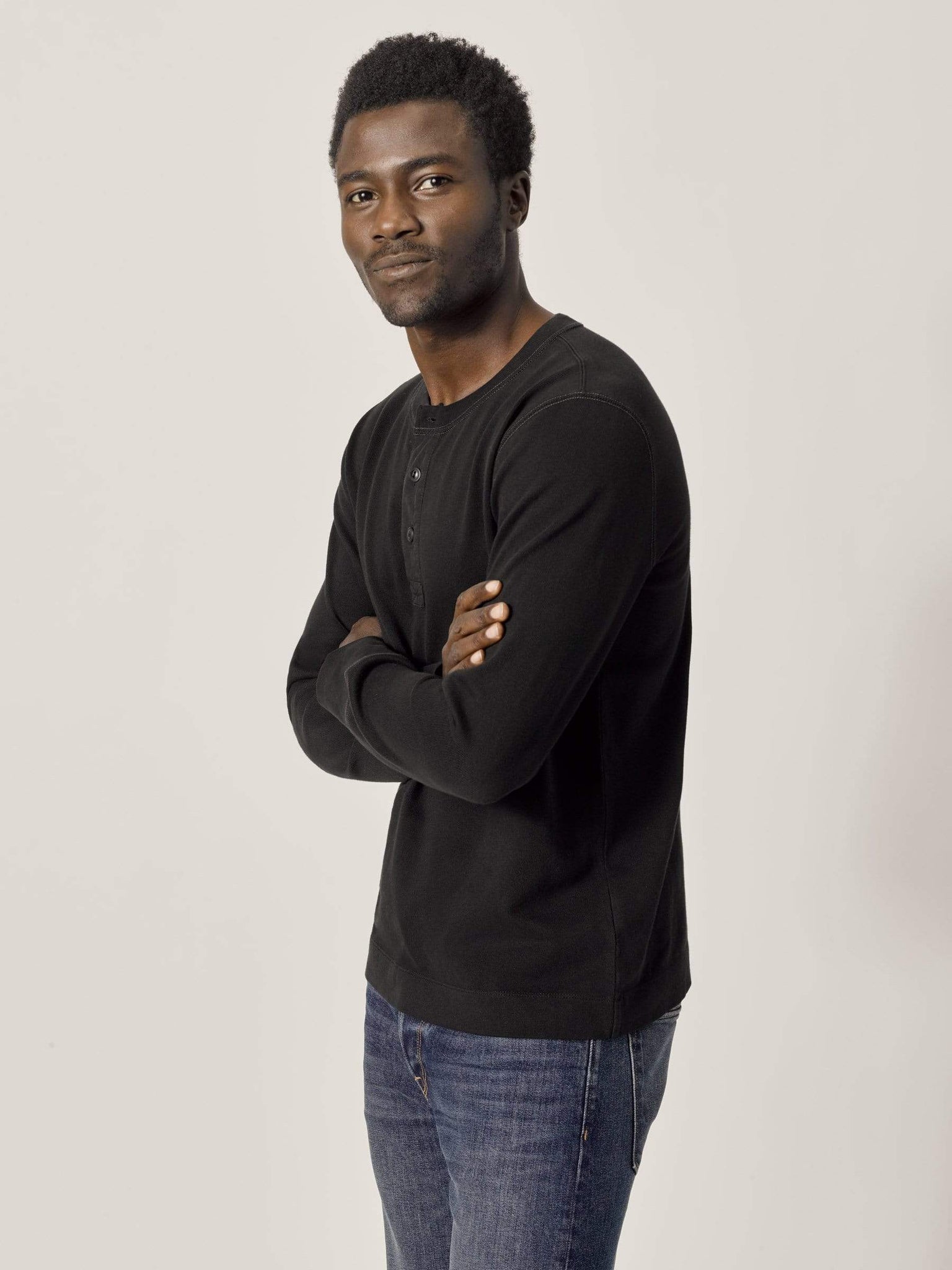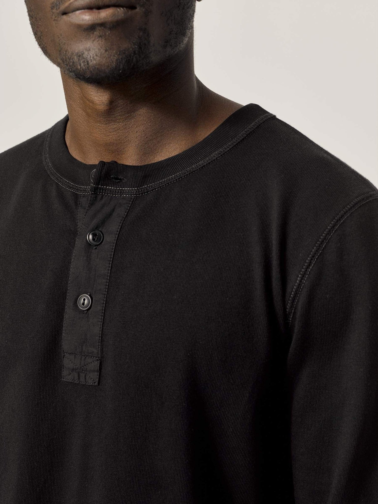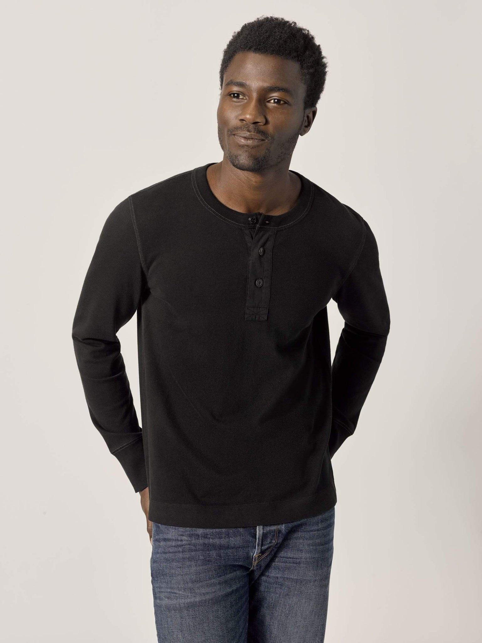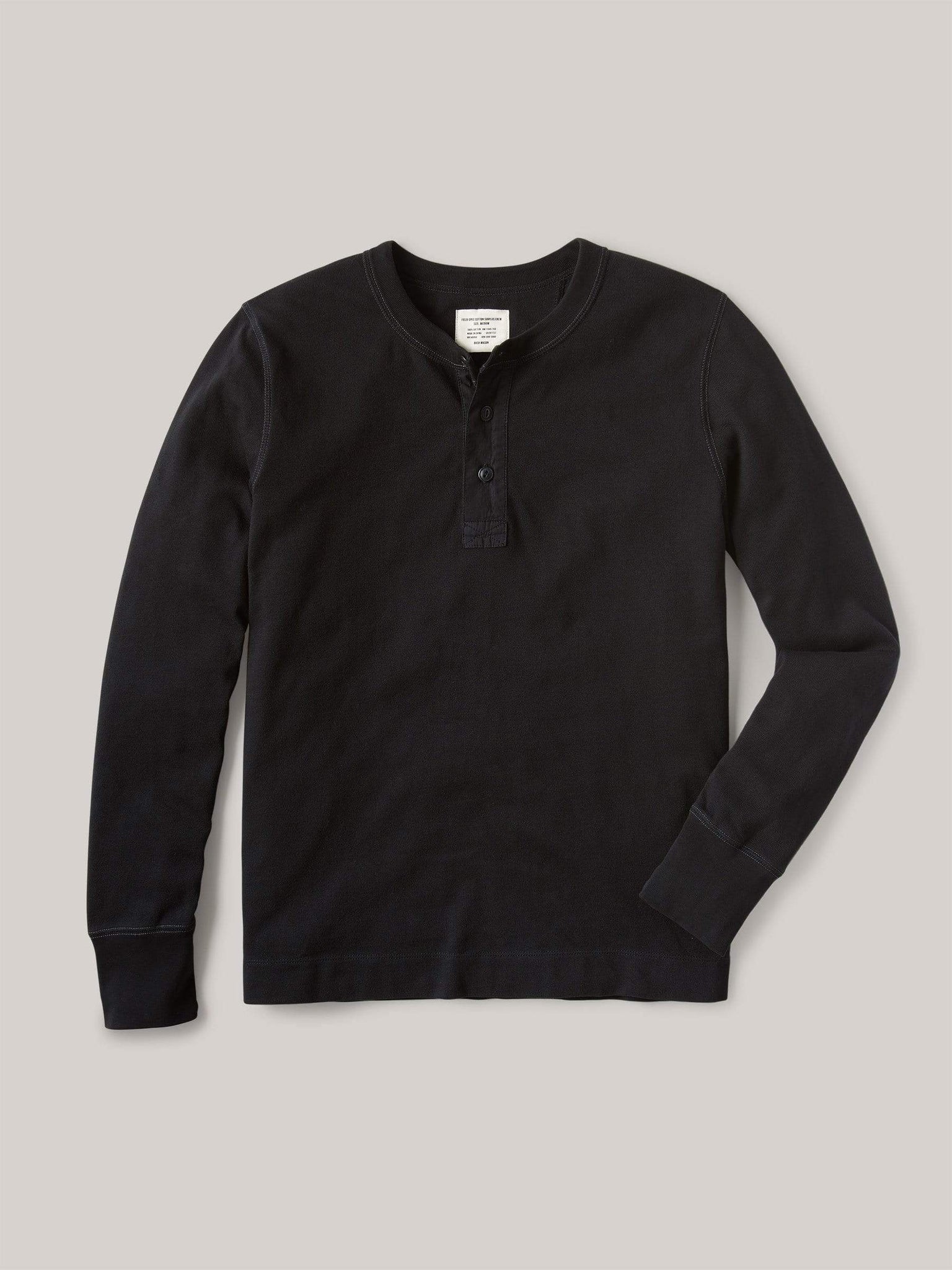 A loose-cut, long sleeve, heavy weight henley, modeled after a vintage athletic shirt. The soft, cotton jersey is about three times heavier than our Pima tee. This is a solid, substantial base-layer for colder weather.