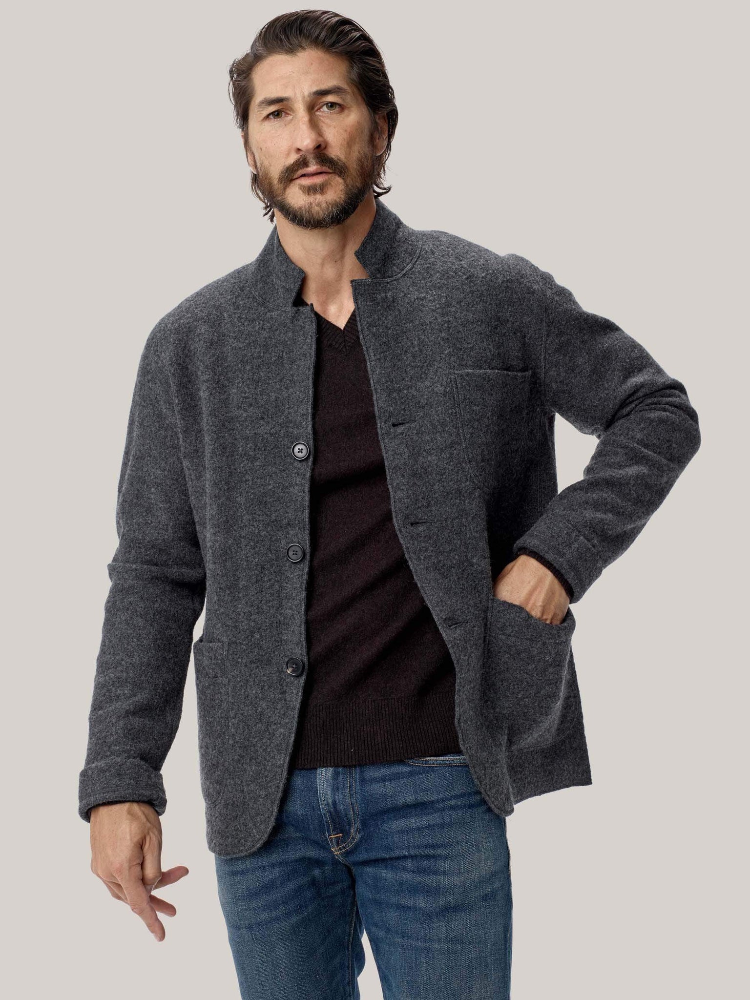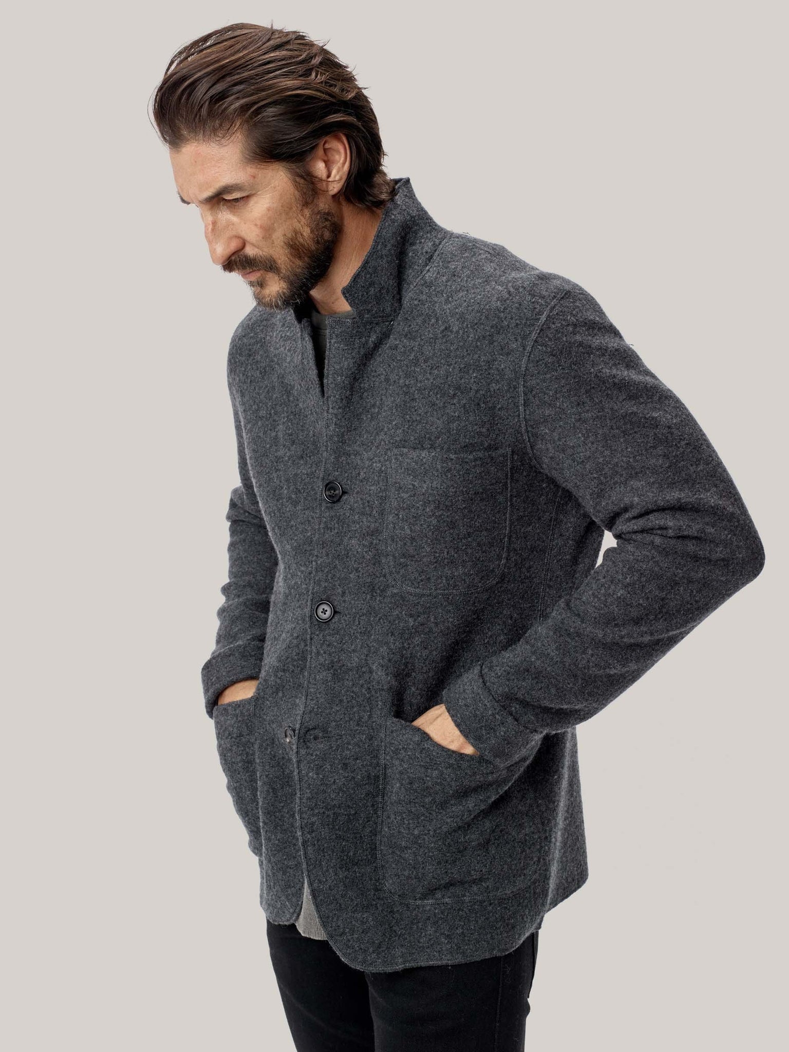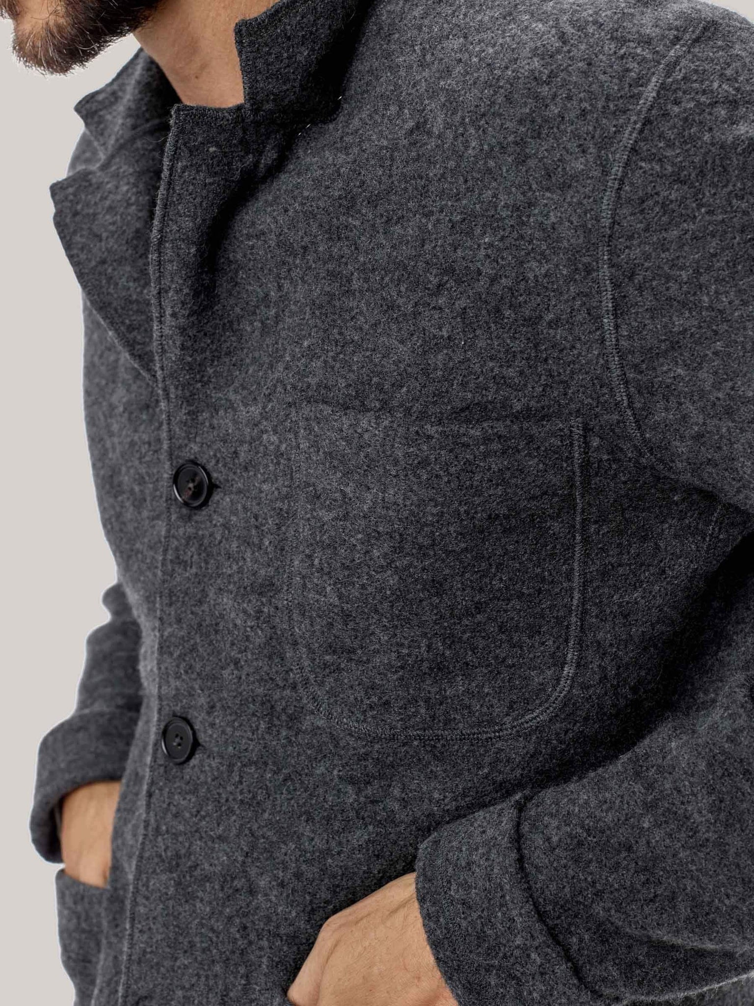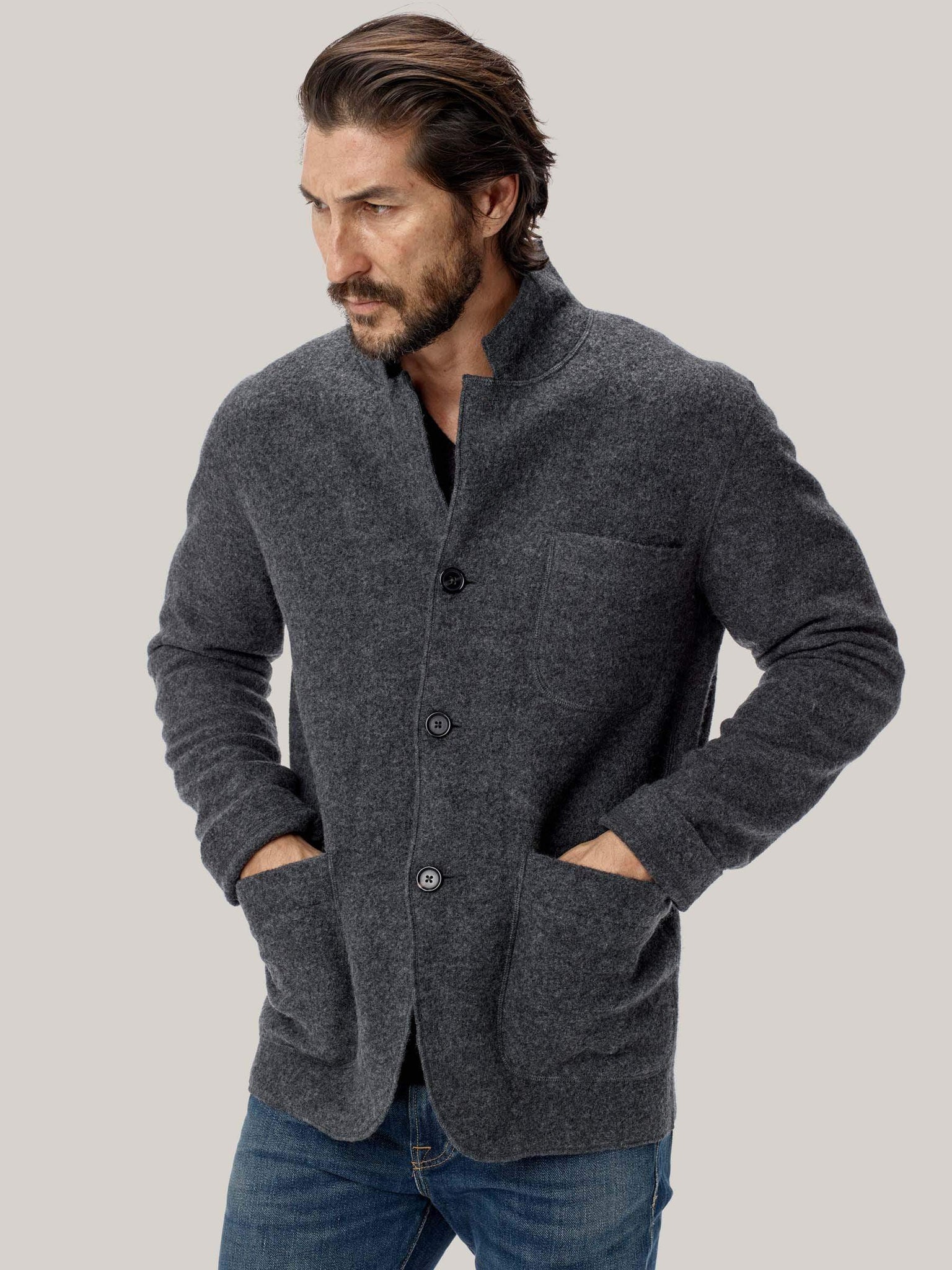 We built our chore coat from boiled Merino wool—a two-part process which creates air pockets in the fiber—perfect for insulation, breathability and keeping out the wind. A vast improvement from traditional blanket-lined chore coats, this tailored jacket also features real horn buttons, and is available in various colors.