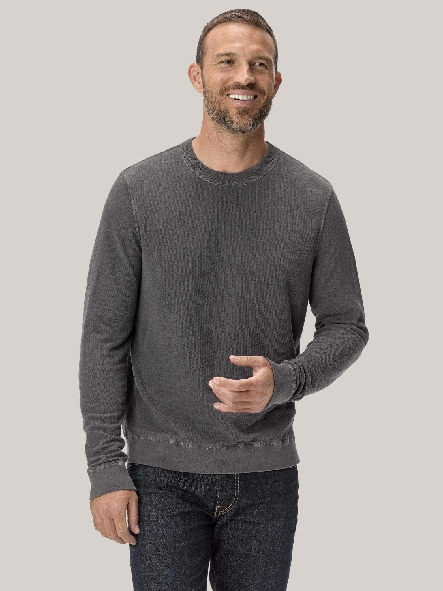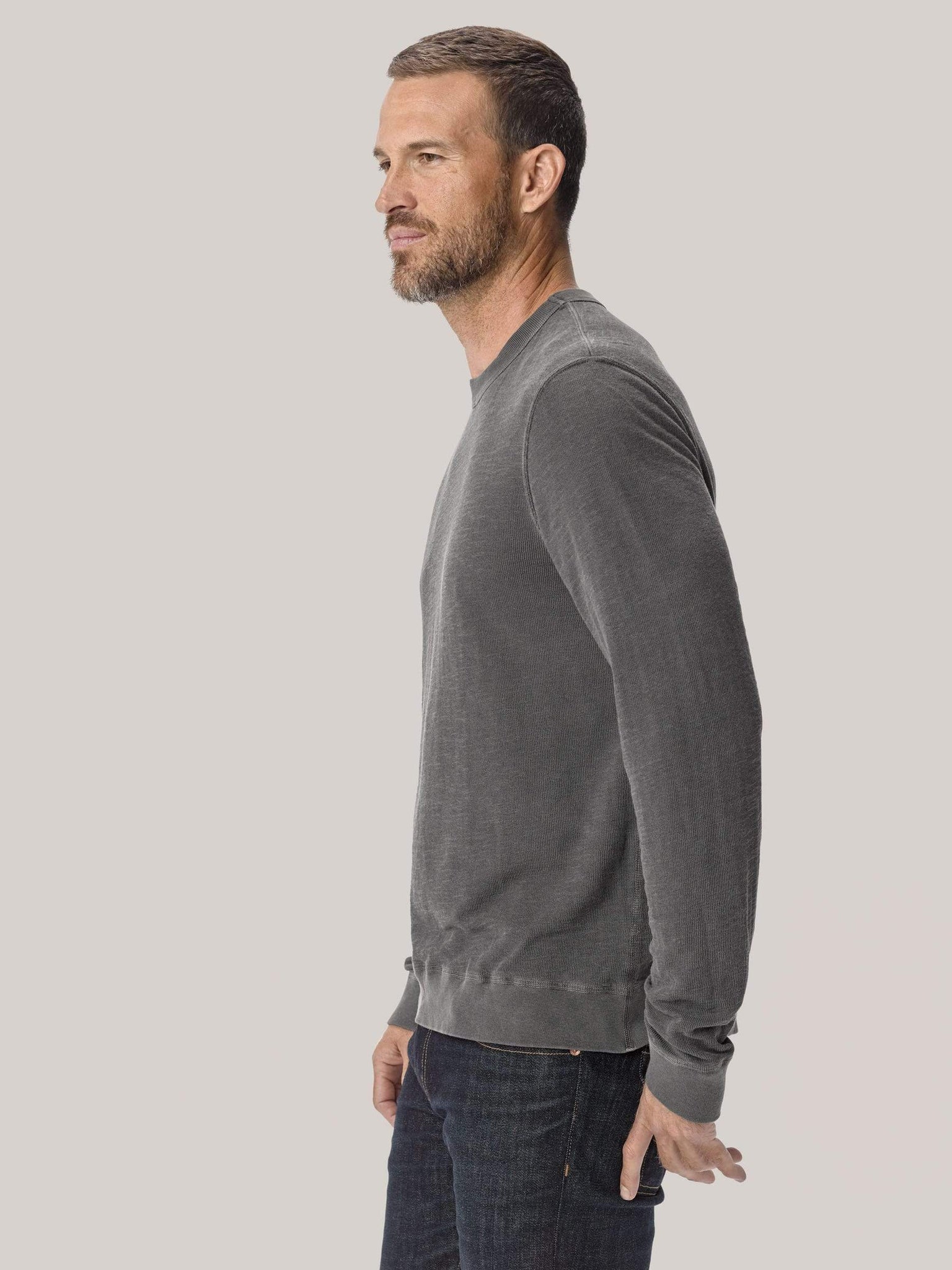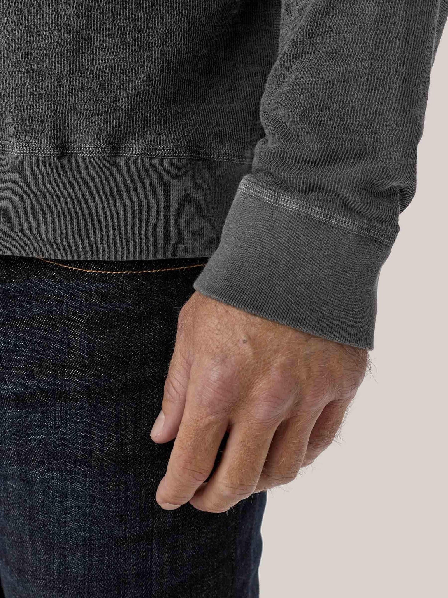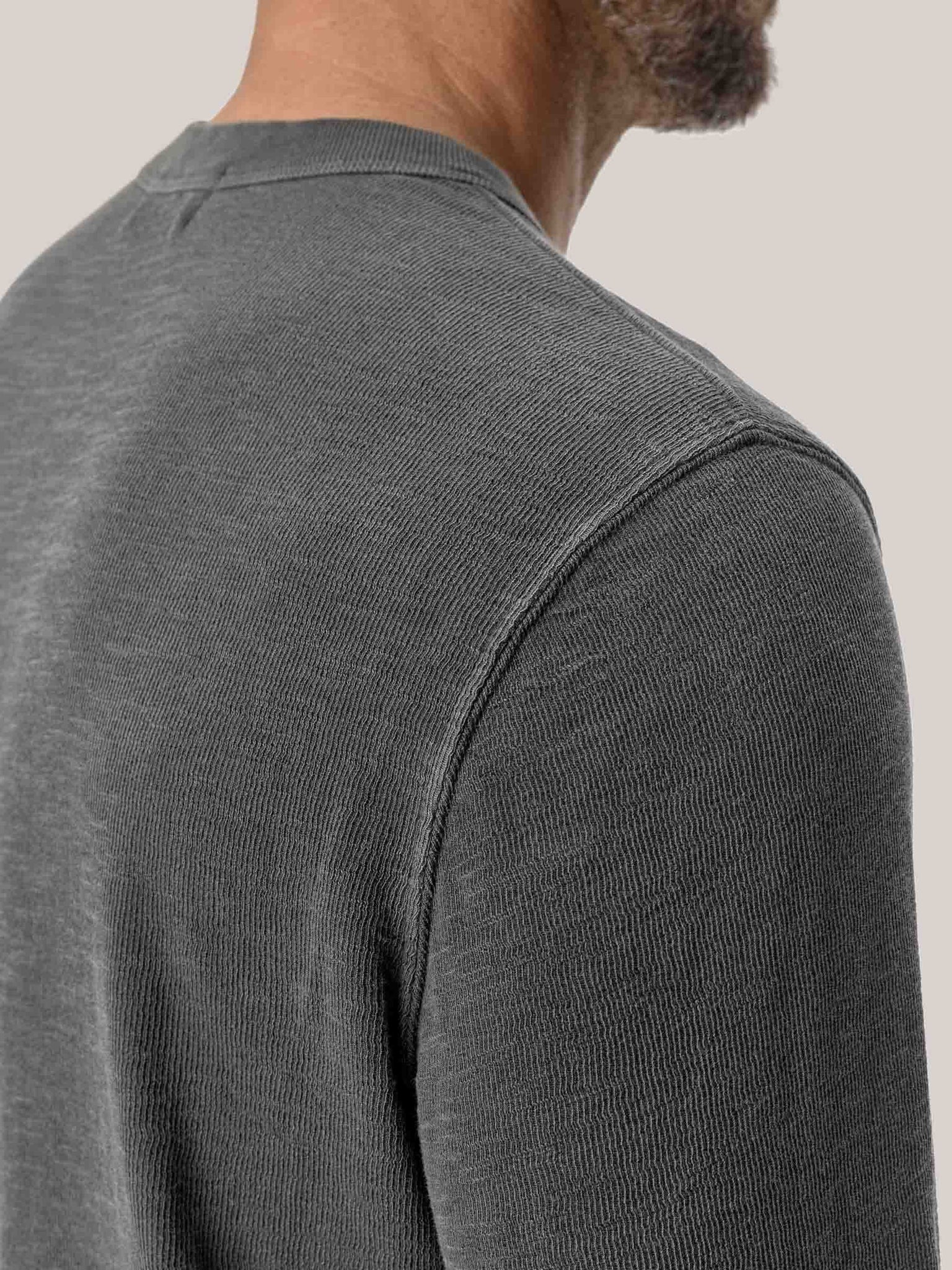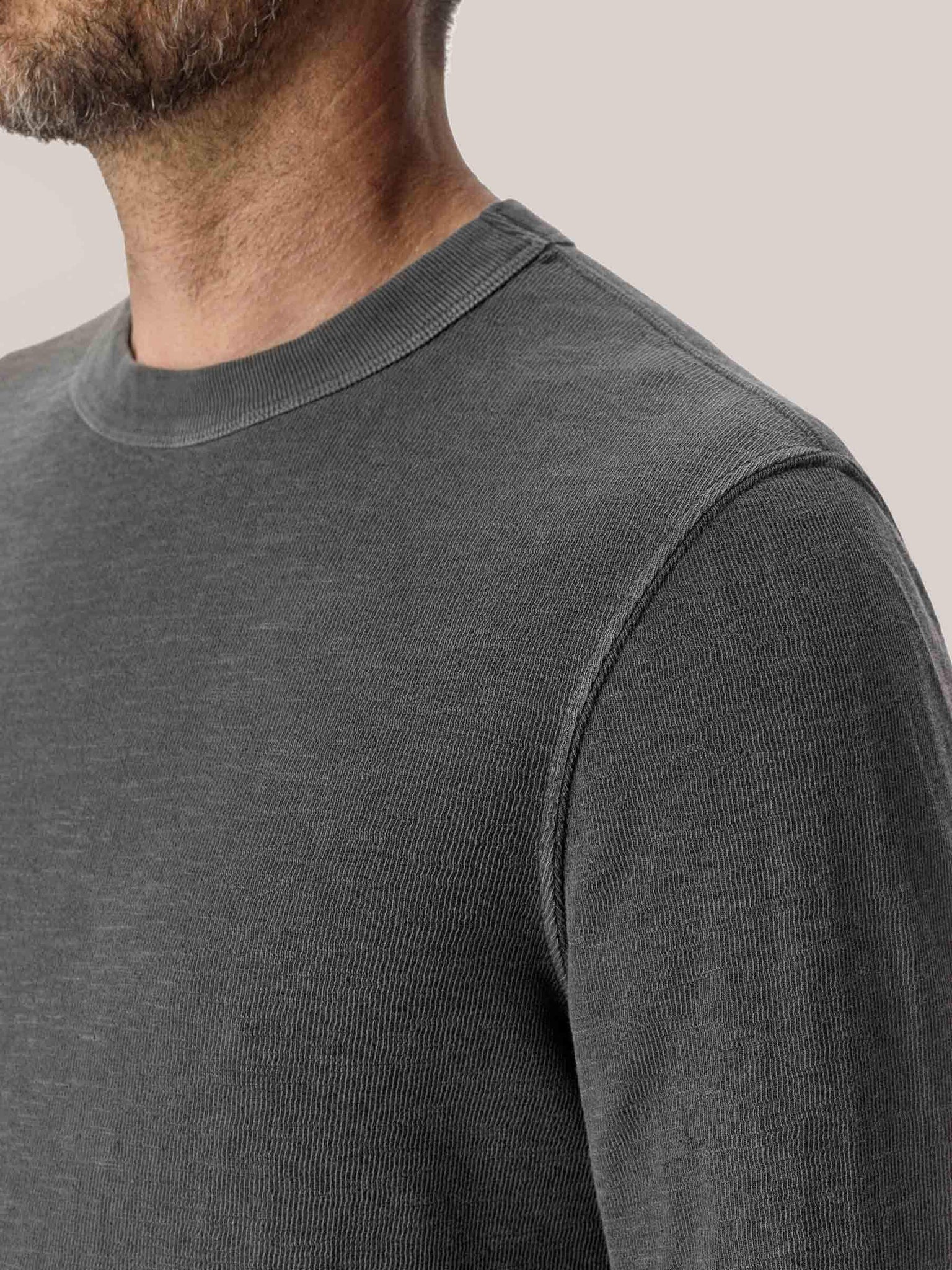 A loose long-sleeve sweatshirt cut from textured cotton. On the inside is a silky, brushed micro-jersey, and on the outside, a beefy slub cotton. The space between them traps heat and circulates warm air without overheating. The cut is modeled on an old-school crew sweatshirt that we dip-dyed in vintage colors.