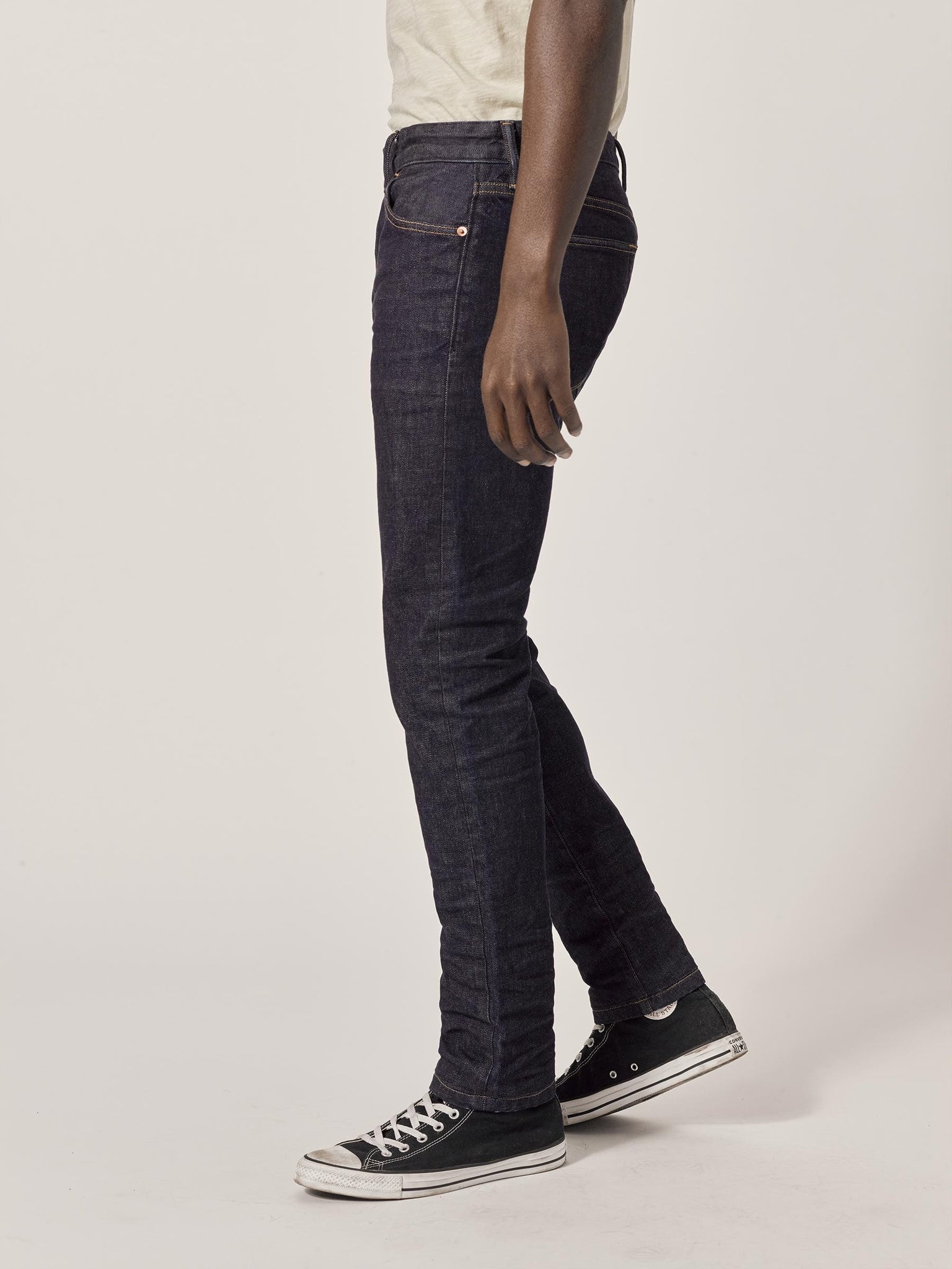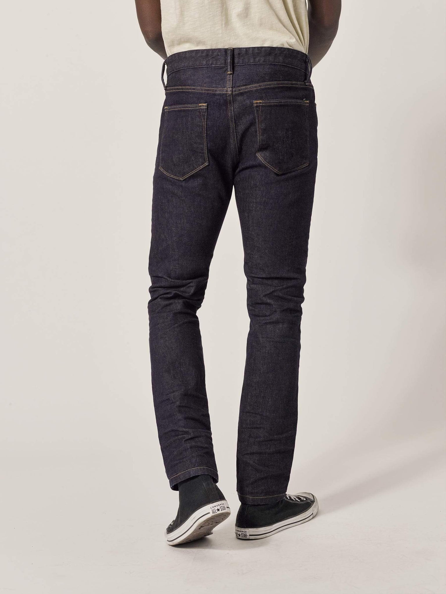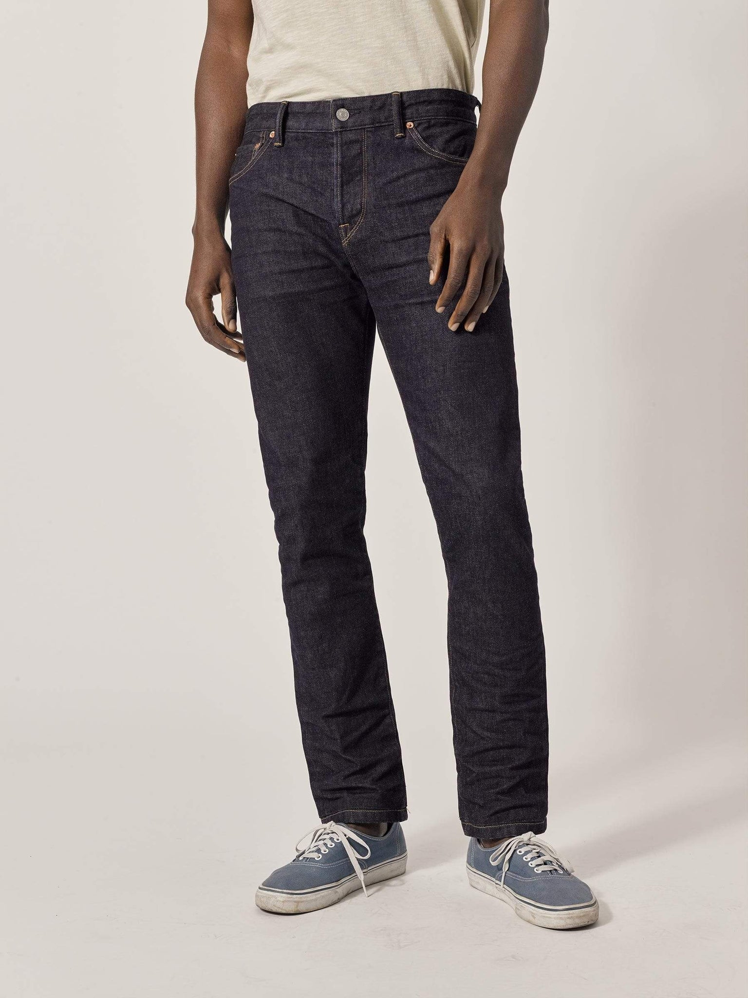 Our Slim Jean has a clean, narrow silhouette through the thigh and leg. Built from Japanese denim, the indigo pigment will gradually shift and marble to produce subtle, natural fades. This pair has a light 3D resin application at the high hip, hem, and knees for a tasteful worn-in look. Resin is like a soft, permanent starch that’s baked into the fabric. 2% stretch means no tough break-in, and plenty of comfort right from the jump.