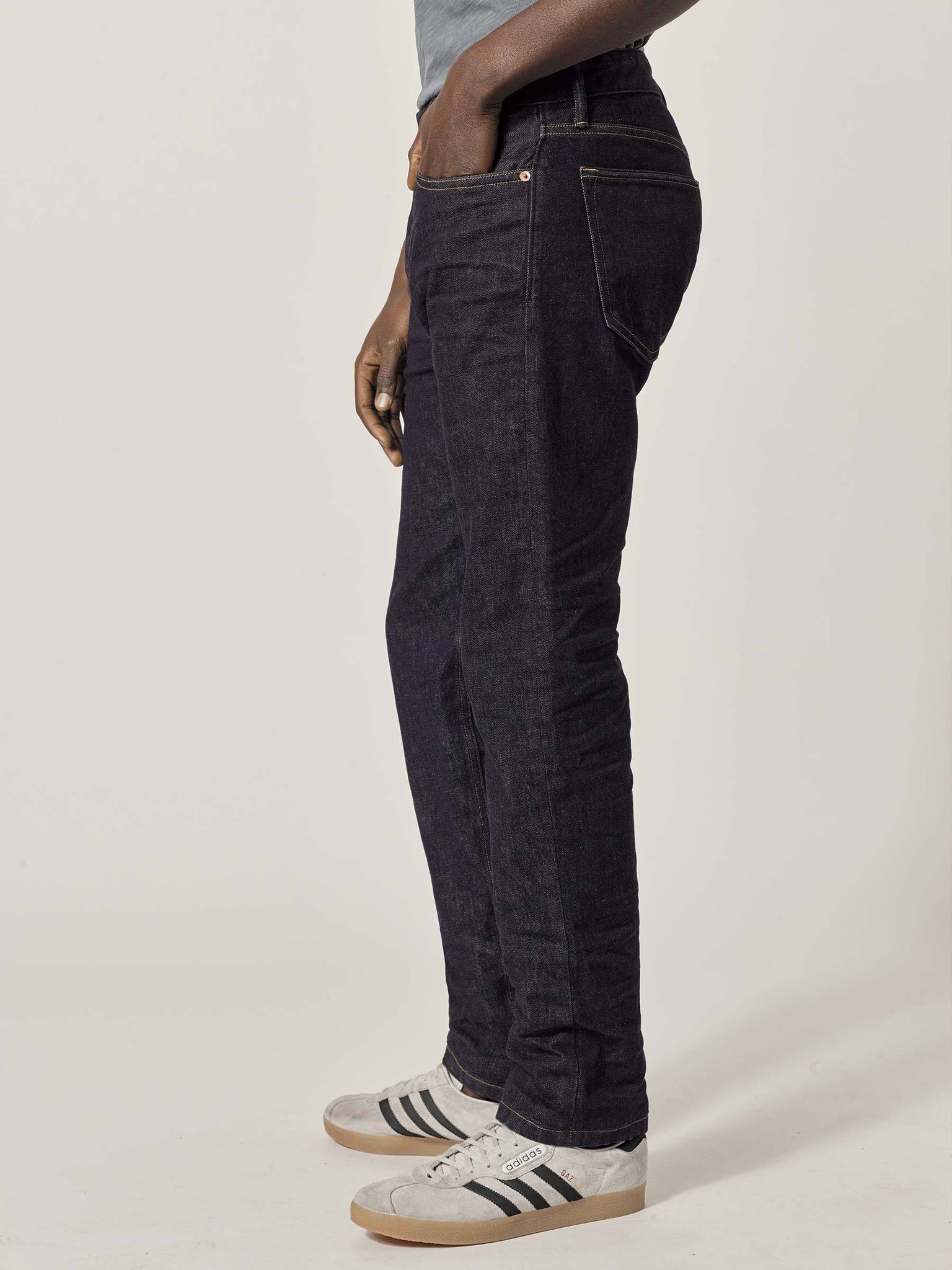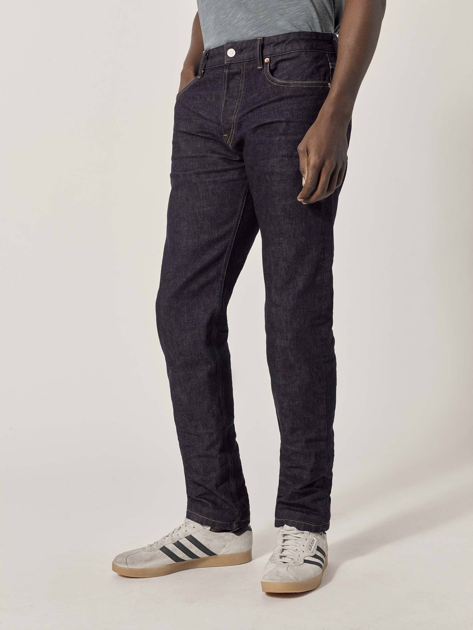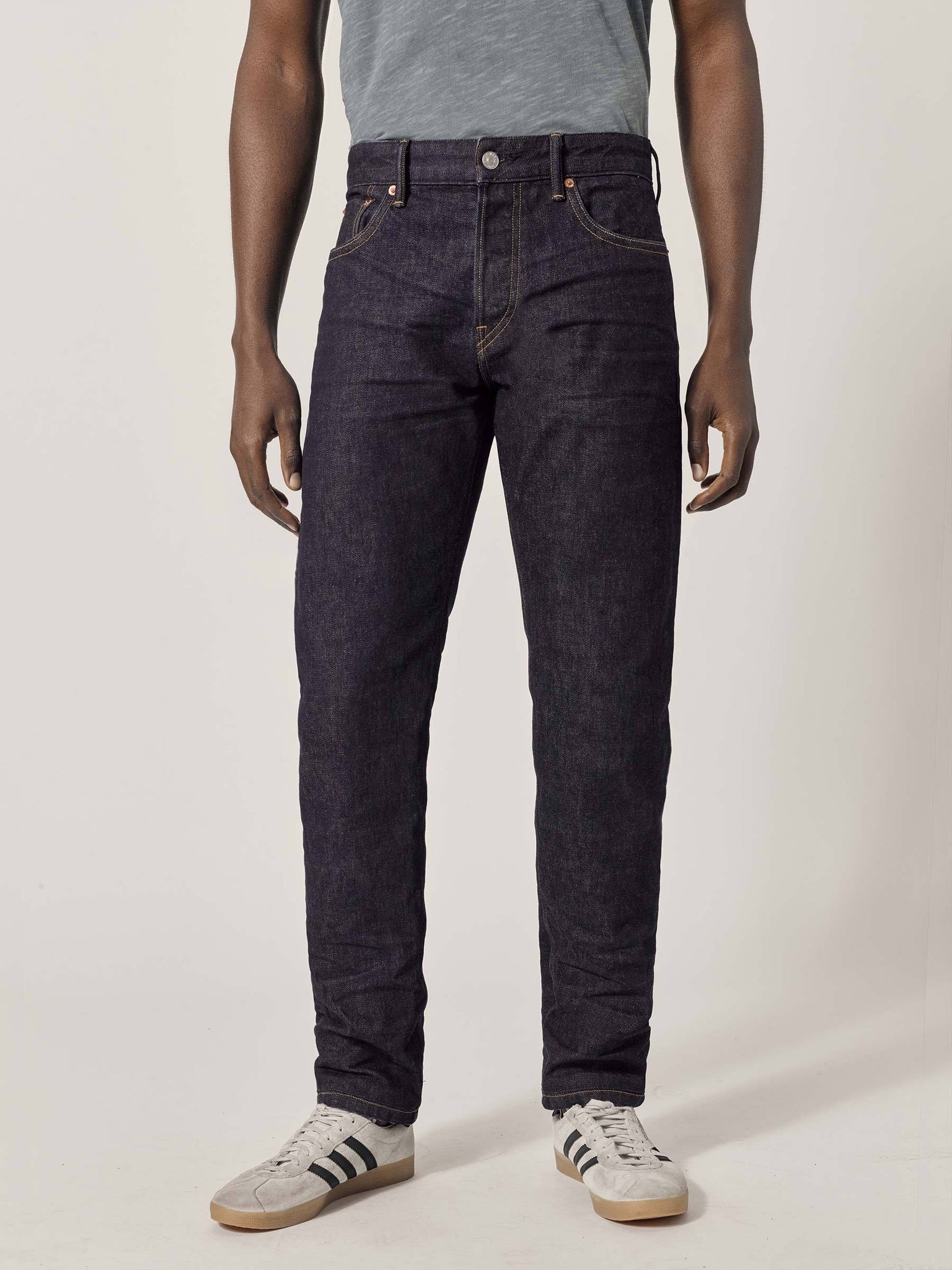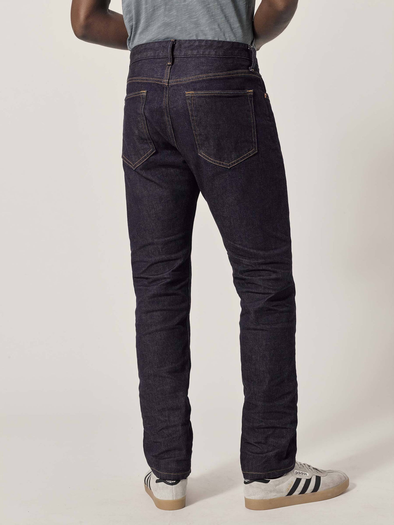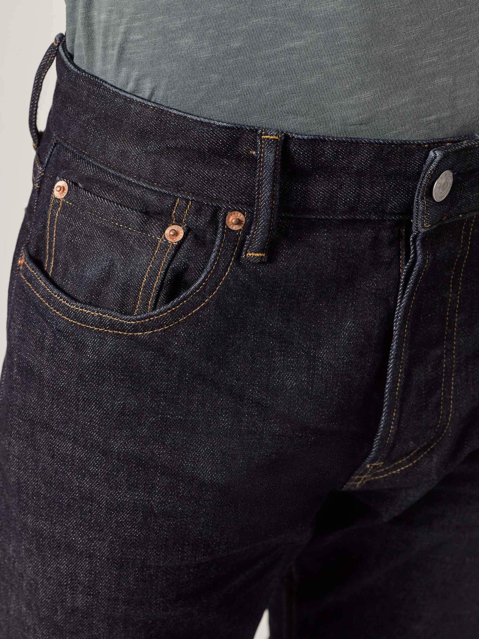 Our standard cut comes with a clean, generous silhouette through the thigh and leg. Built from Japanese denim, the indigo pigment will gradually shift and marble to produce subtle, natural fades. This pair has a light 3D resin application at the high hip, hem, and knees for a tasteful worn-in look. Resin is like a soft, permanent starch that’s baked into the fabric. 2% stretch means no tough break-in, and plenty of comfort right from the jump.