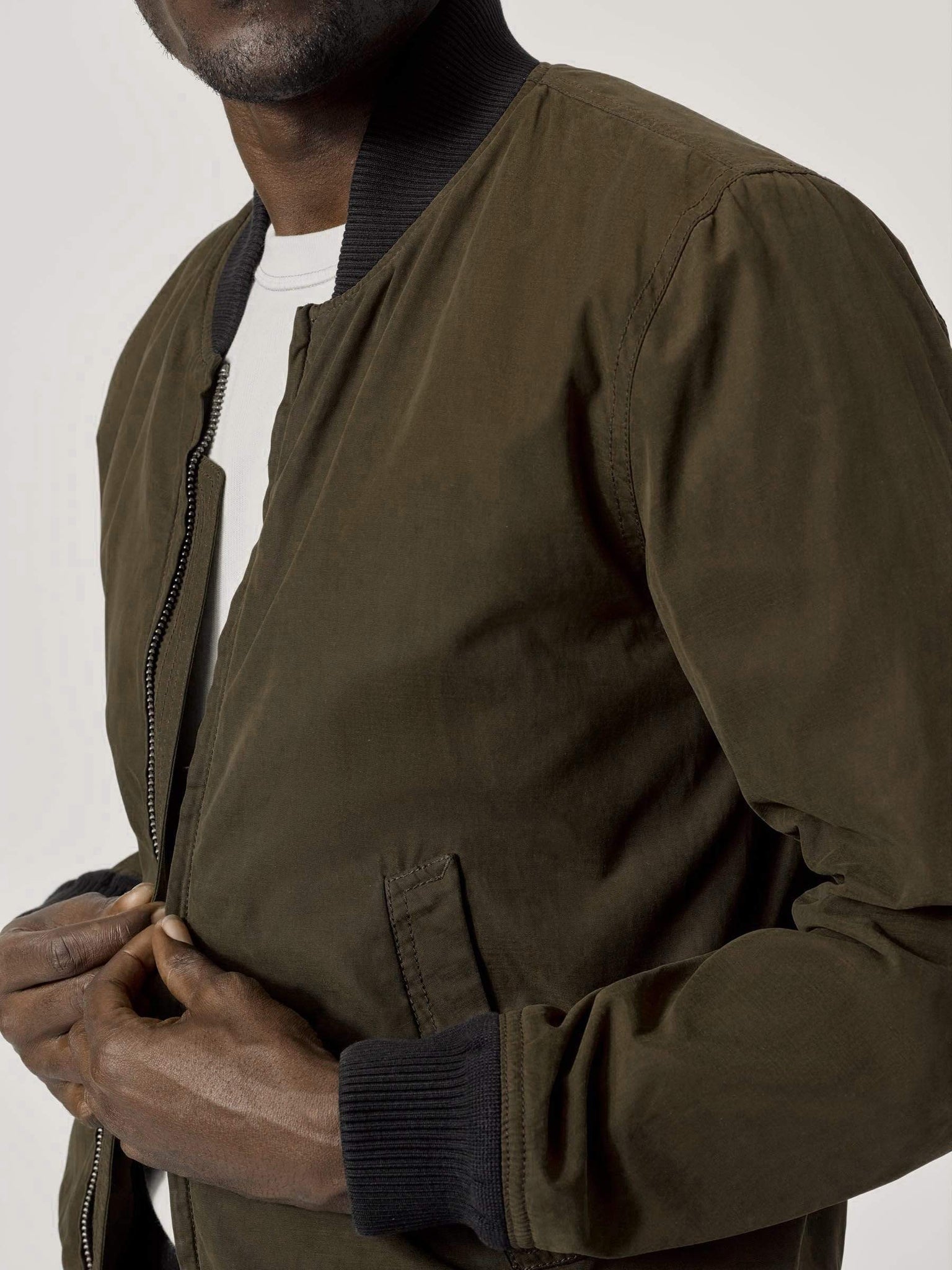 A fully-lined, full-fitting bomber jacket cut from lightweight, blended fabric with a water repellent waxed finish. We love the time-tested silhouette of a bomber, but we wanted to make it in a year-round fabric. This style comes with angled hip pockets (with soft, corduroy pocket bags), articulating, 2-piece sleeves with elbow pleats (for added mobility), and a comfortable, quilted lining. We cut this jacket in a lightweight blended fabric with a wax finish, and heat-gunned the seams for added water-repellency. It’s got all the style of an old-school bomber, with a fraction of the bulk.