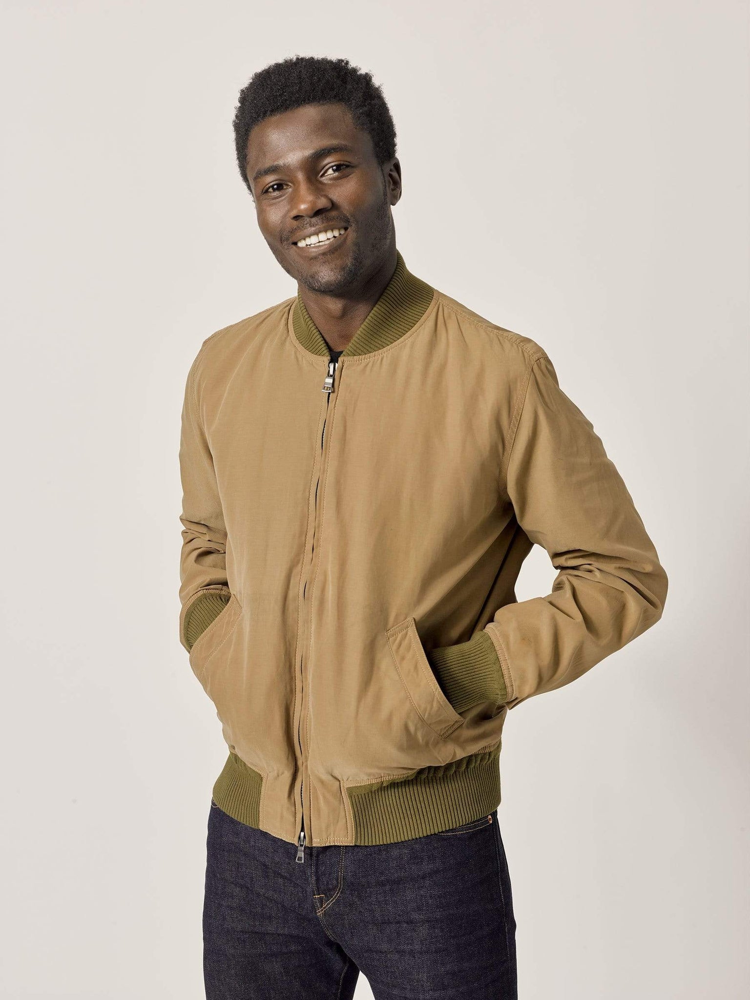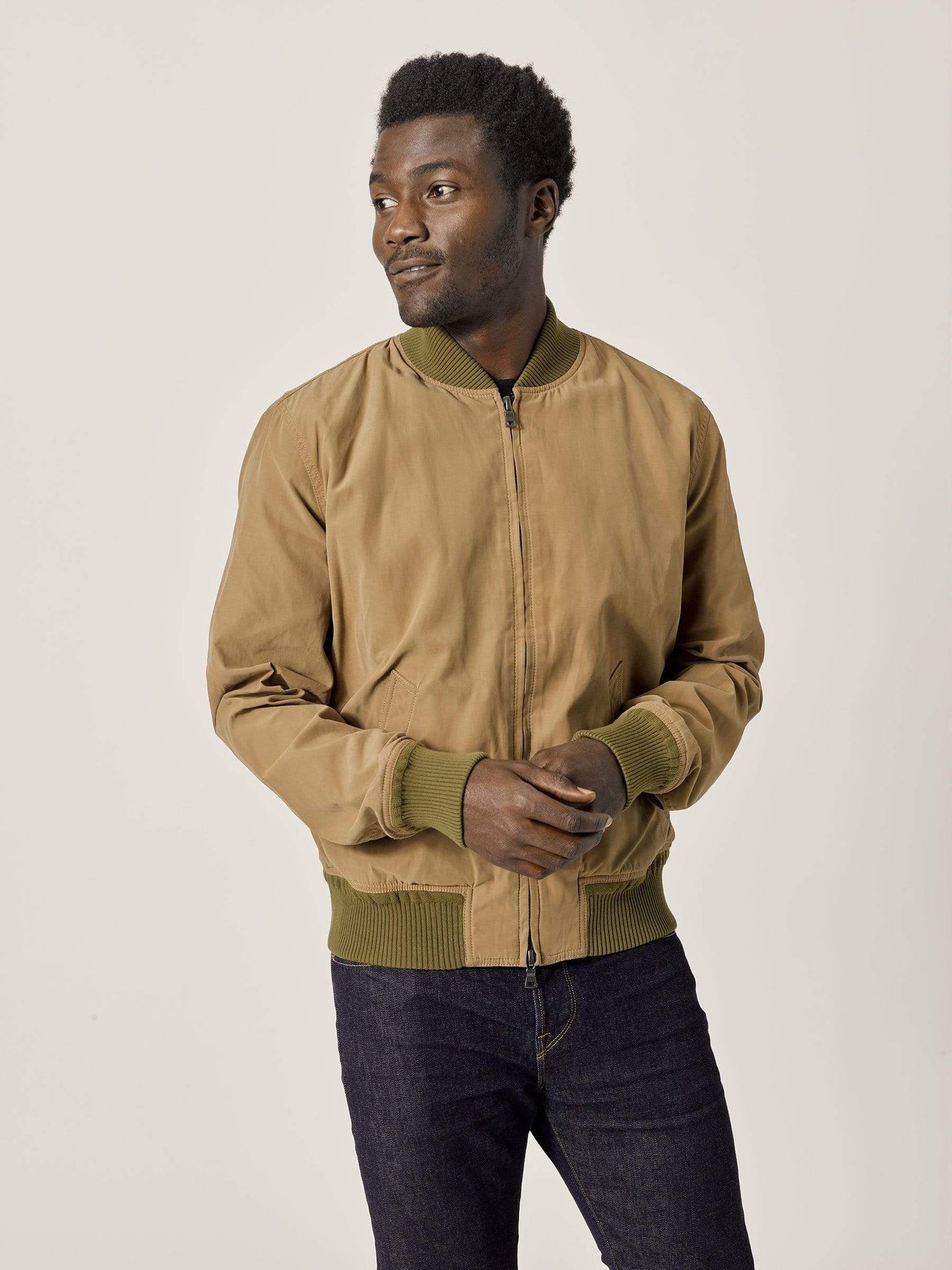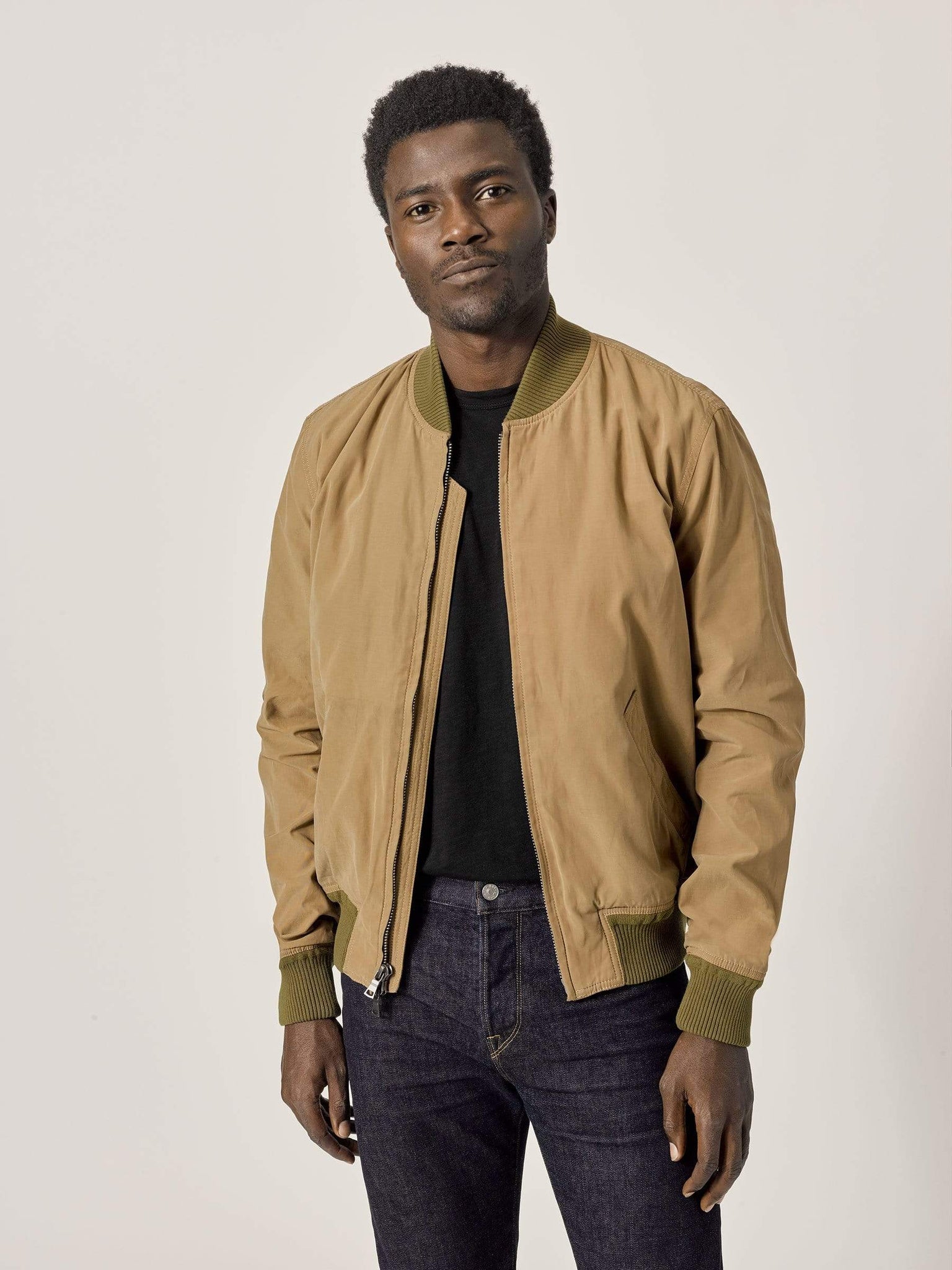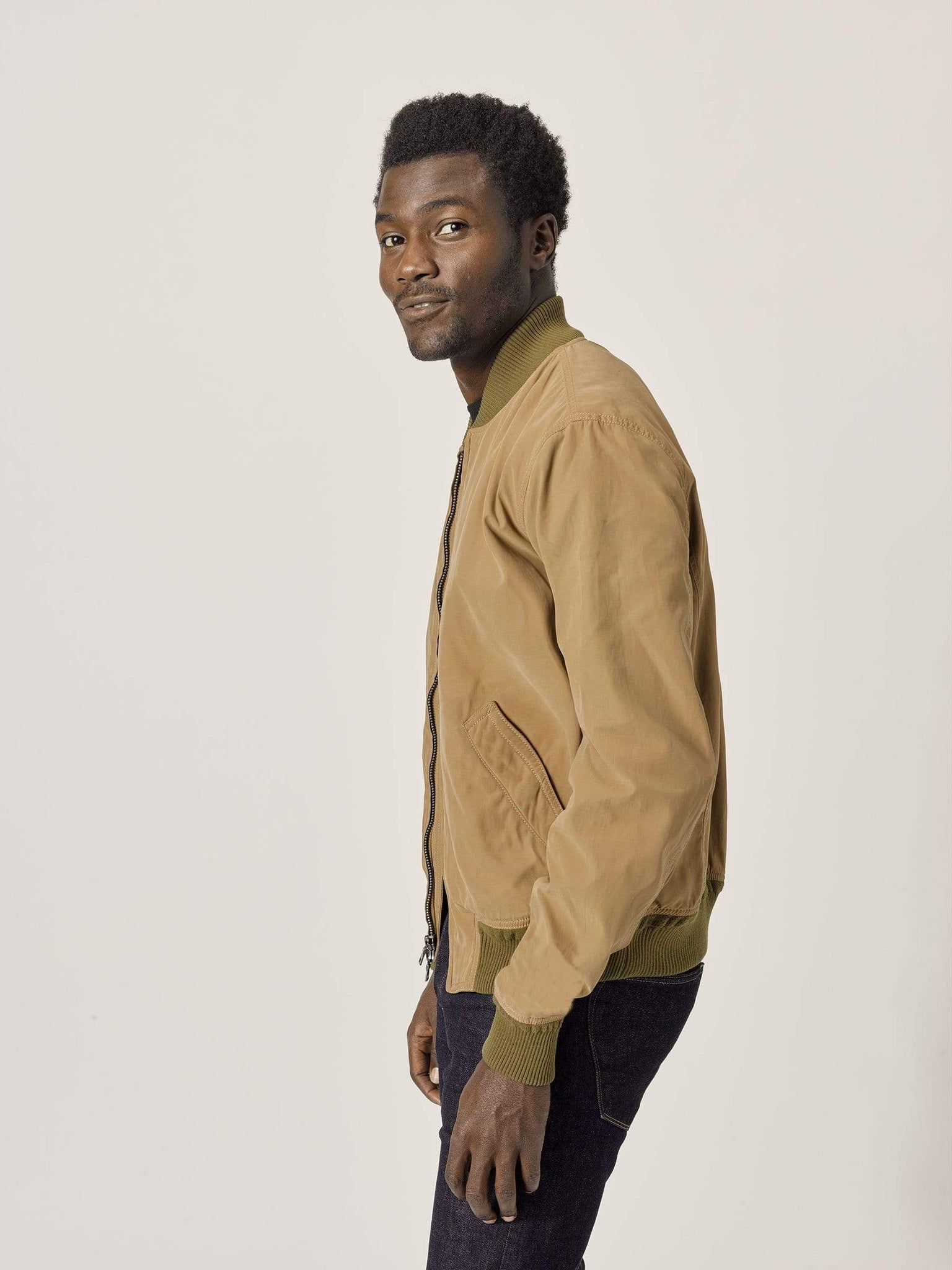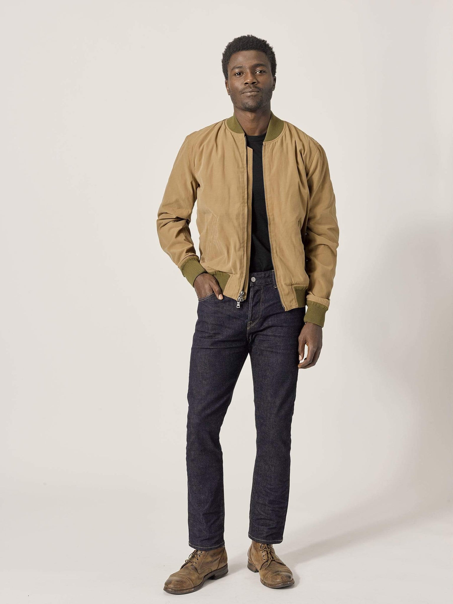 A fully-lined, full-fitting bomber jacket cut from lightweight, blended fabric with a water repellent waxed finish. We love the time-tested silhouette of a bomber, but we wanted to make it in a year-round fabric. This style comes with angled hip pockets (with soft, corduroy pocket bags), articulating, 2-piece sleeves with elbow pleats (for added mobility), and a comfortable, quilted lining. We cut this jacket in a lightweight blended fabric with a wax finish, and heat-gunned the seams for added water-repellency. It’s got all the style of an old-school bomber, with a fraction of the bulk.