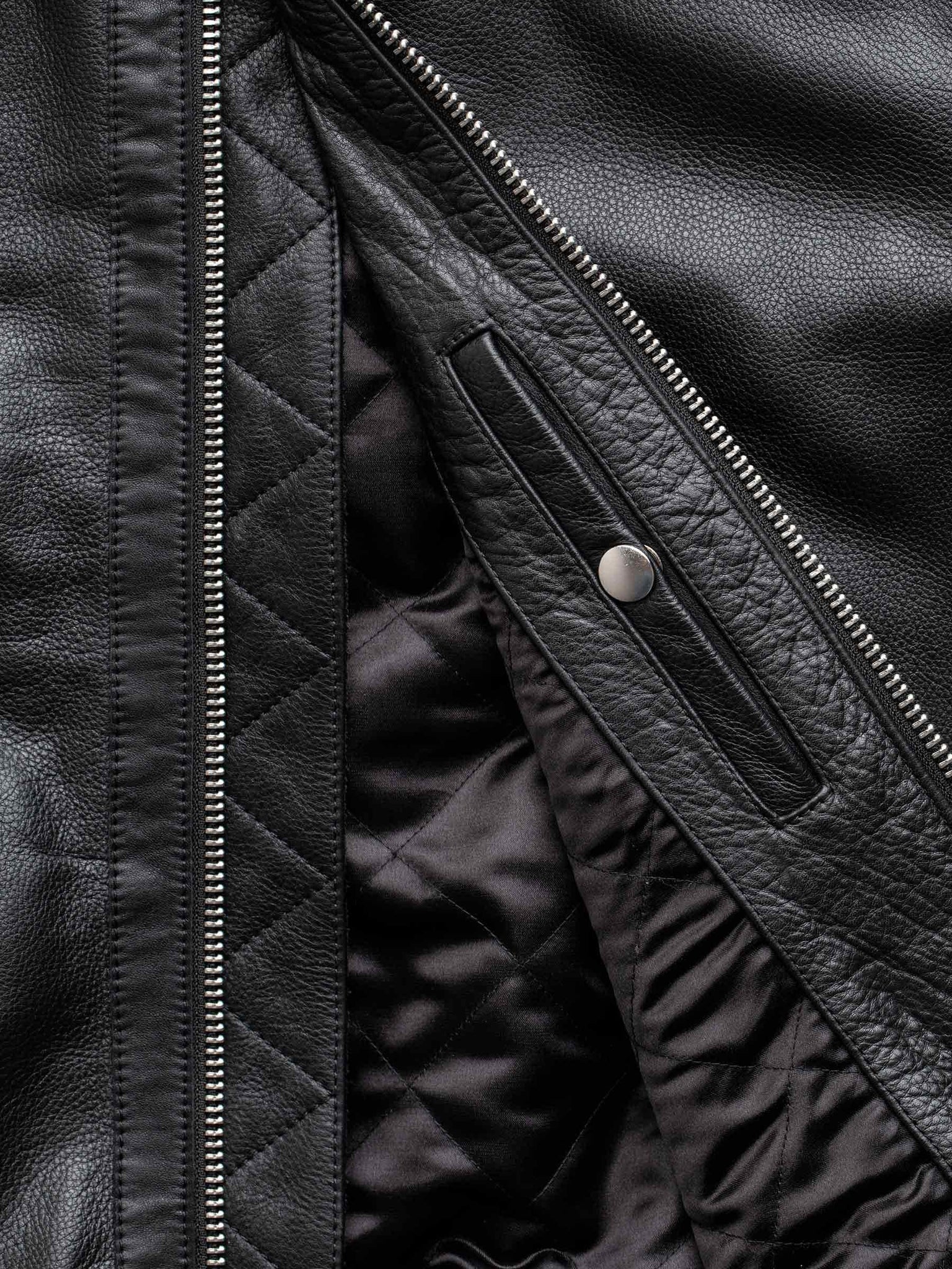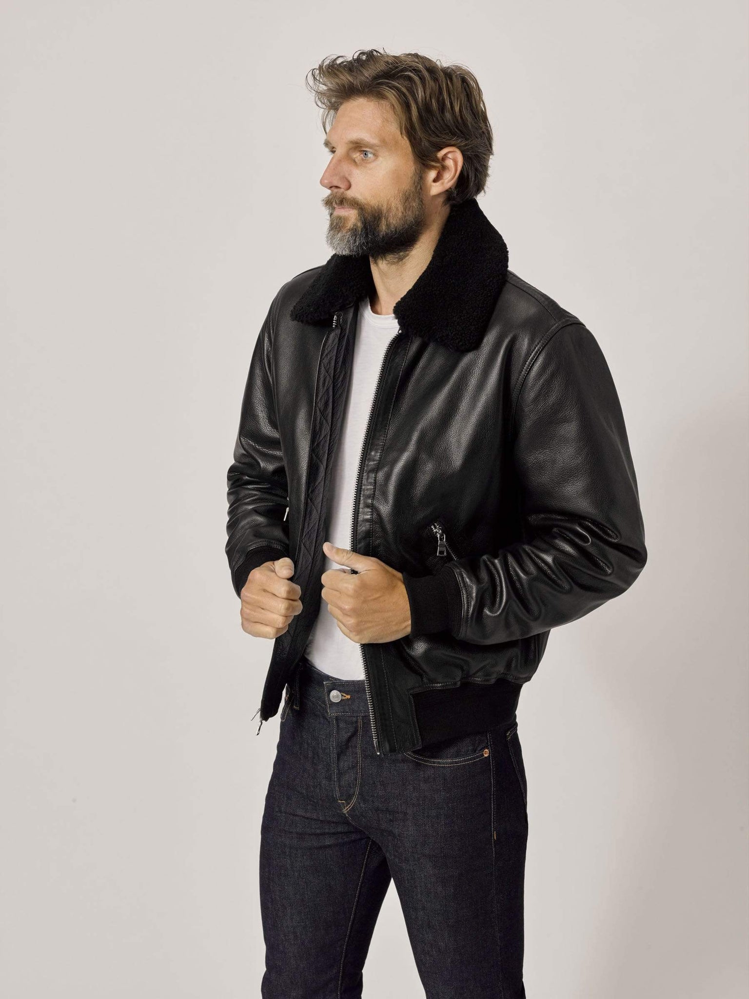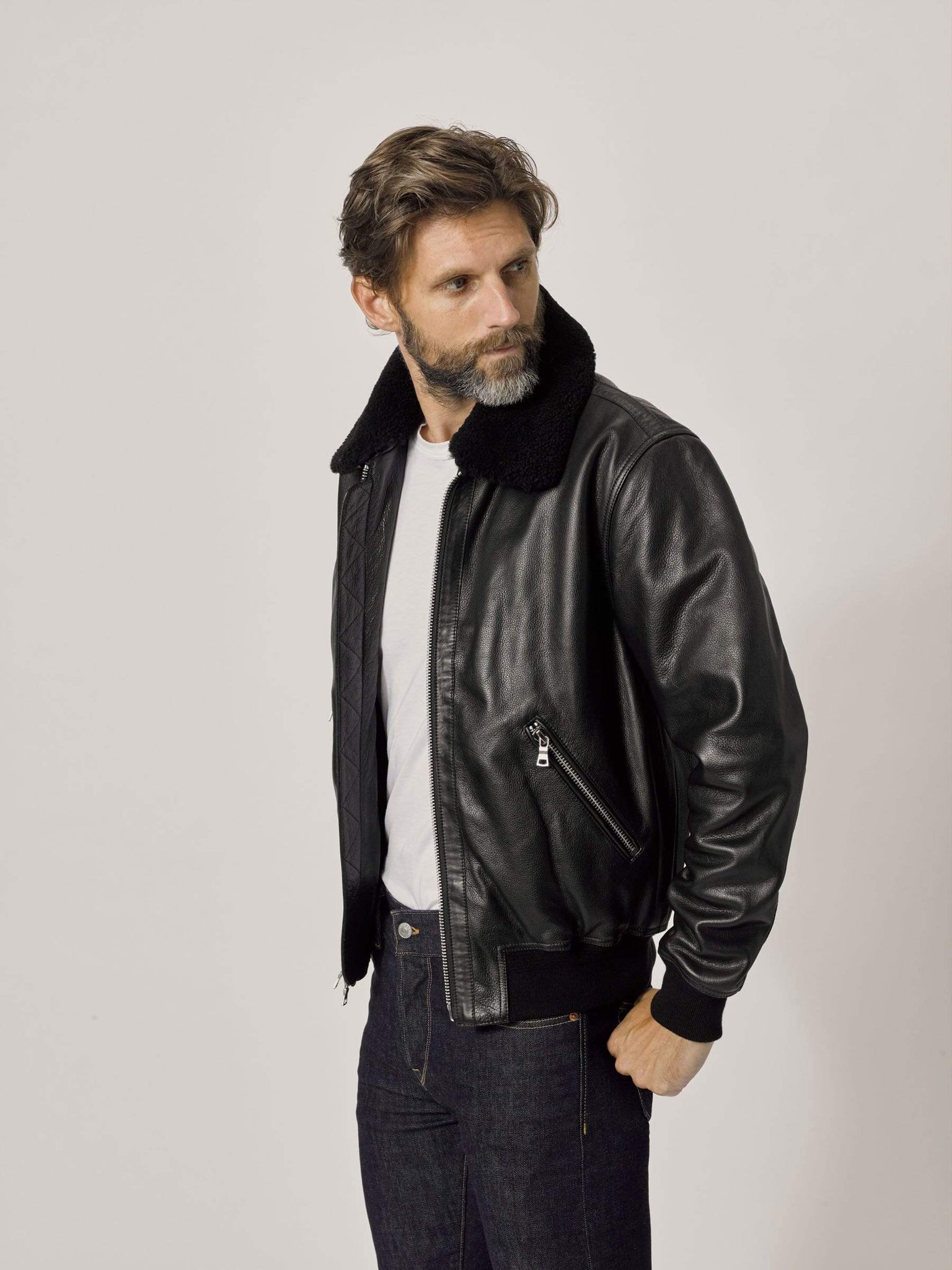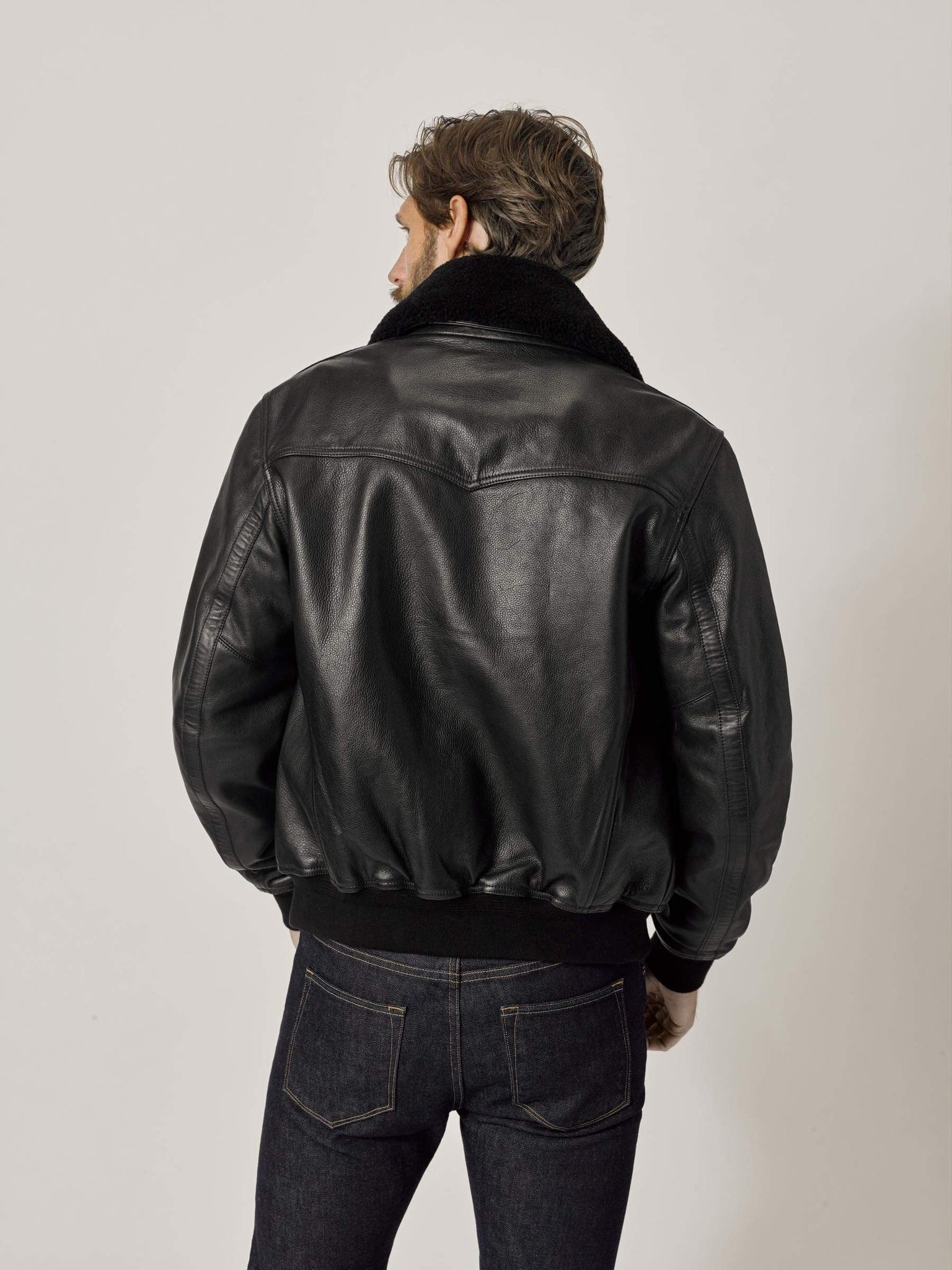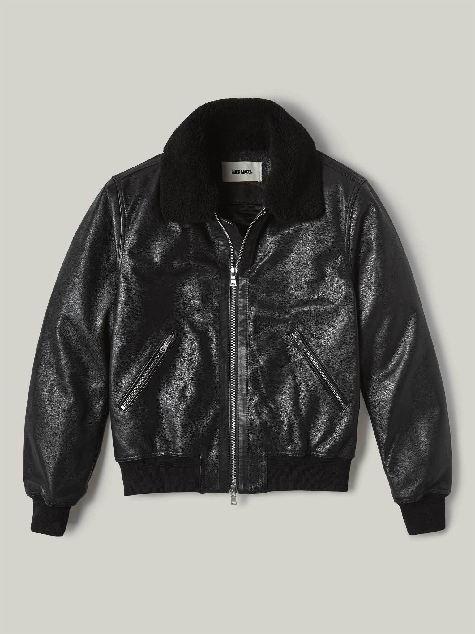 A classic bomber cut from soft, supple, full grain cowhide. Details include angled zip pockets at the hip, tape detailing at the center front zipper, a western-style yoke, removable shearling collar, and a quilted satin lining. This bomber is the genuine article, a heritage piece with an updated, slightly cropped fit. The full grain leather is soft right off the rack, and the patina will pay dividends for years to come.