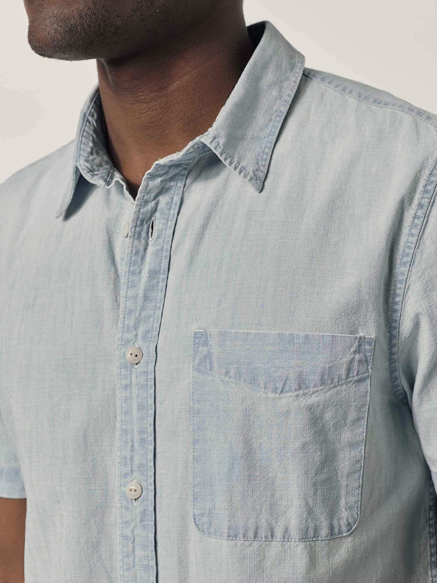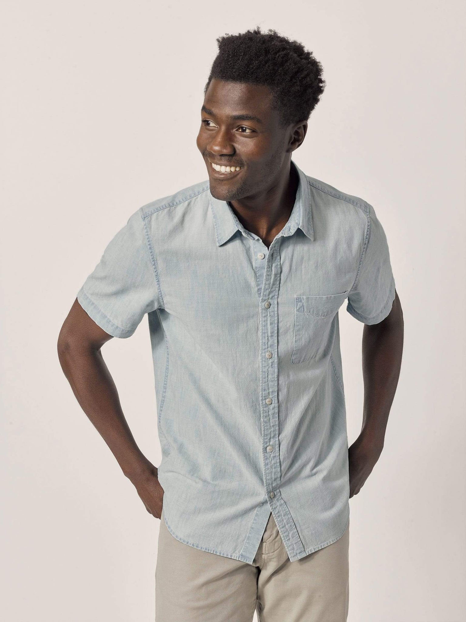 The Chambray Shirt has been at the core of our collection since the very beginning. This tailored take a workwear staple is accented with authentic cats-eye resin buttons and hits just above the elbow. Chambray looks like denim, but with a looser, plain weave that behaves more like linen than a pair of blue jeans. We always felt that vintage chambray shirts were too long in the collar, so we shortened ours up for a more modern finish.