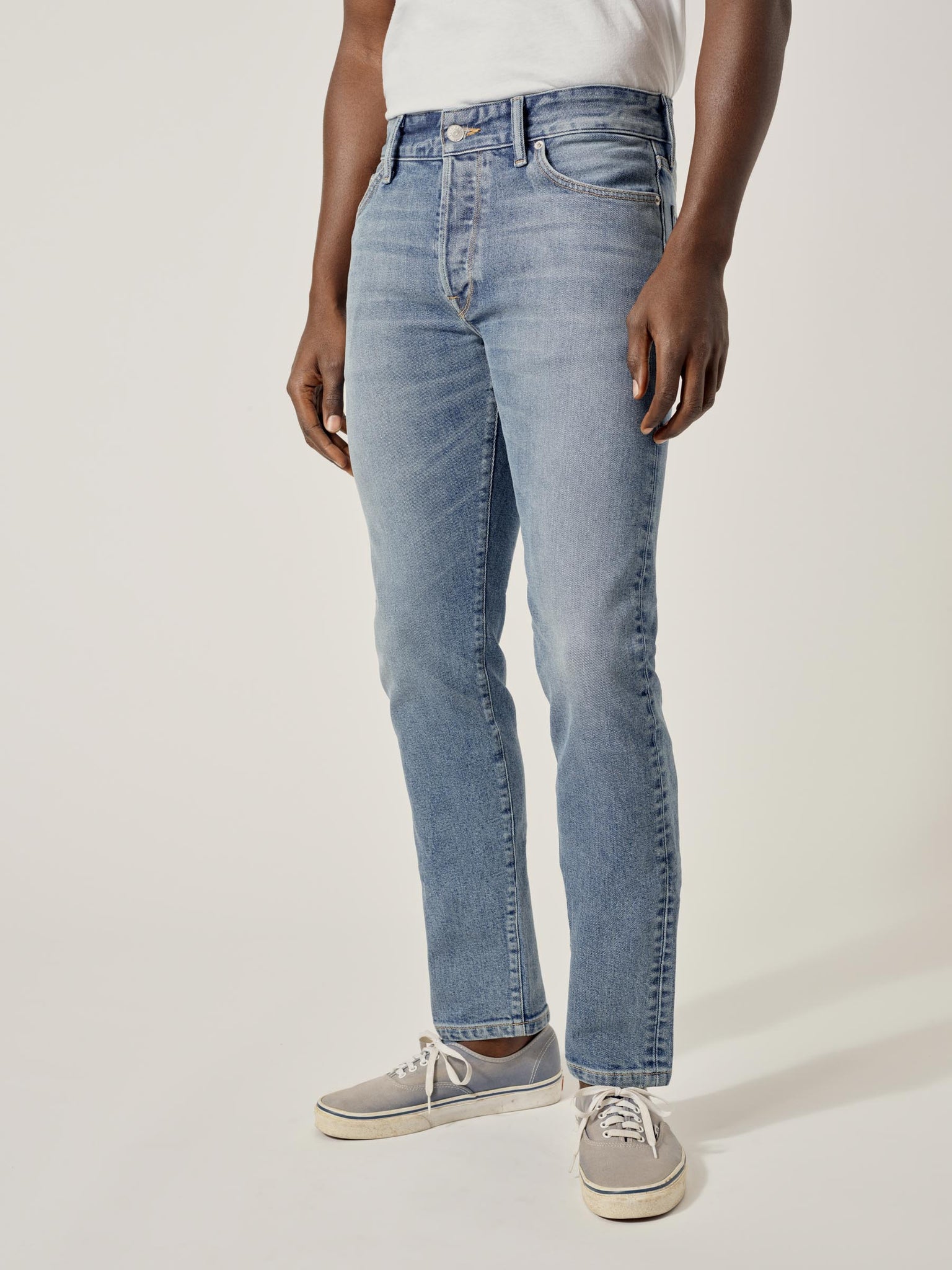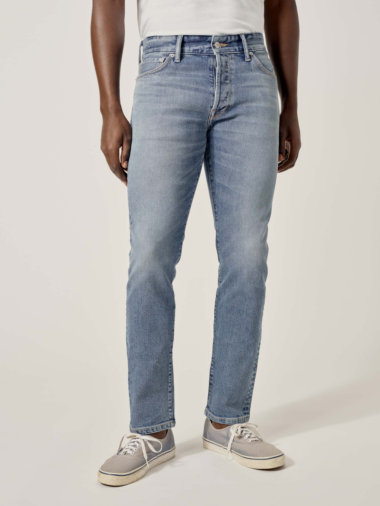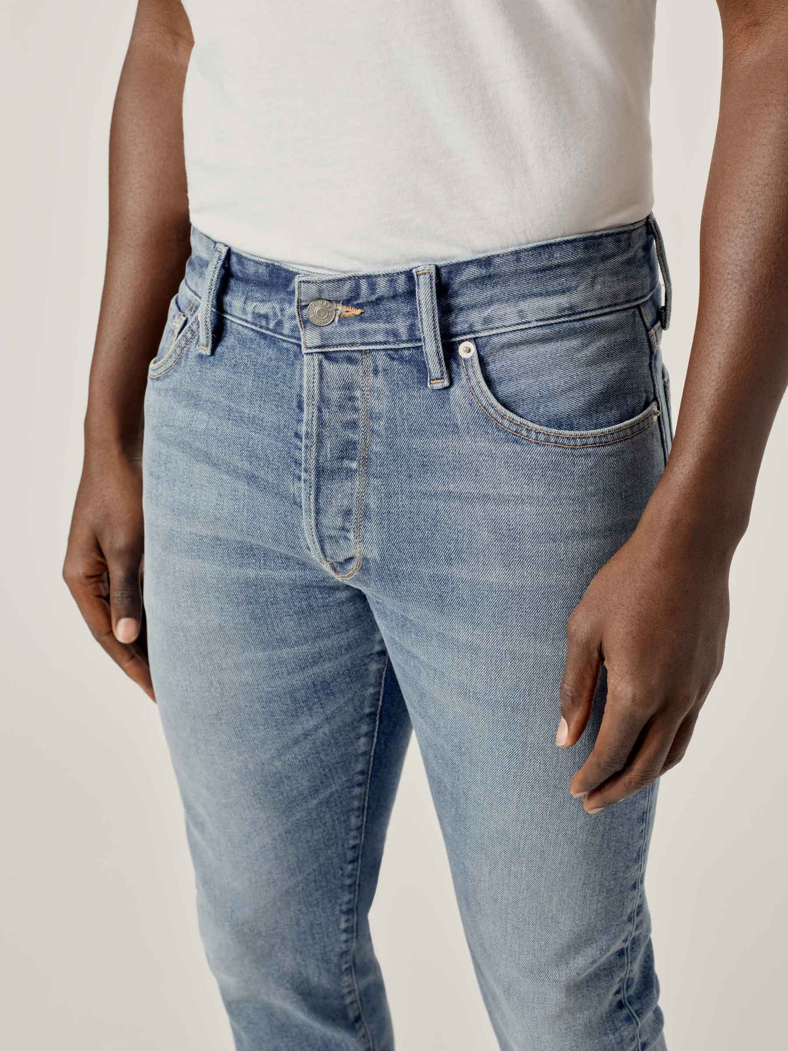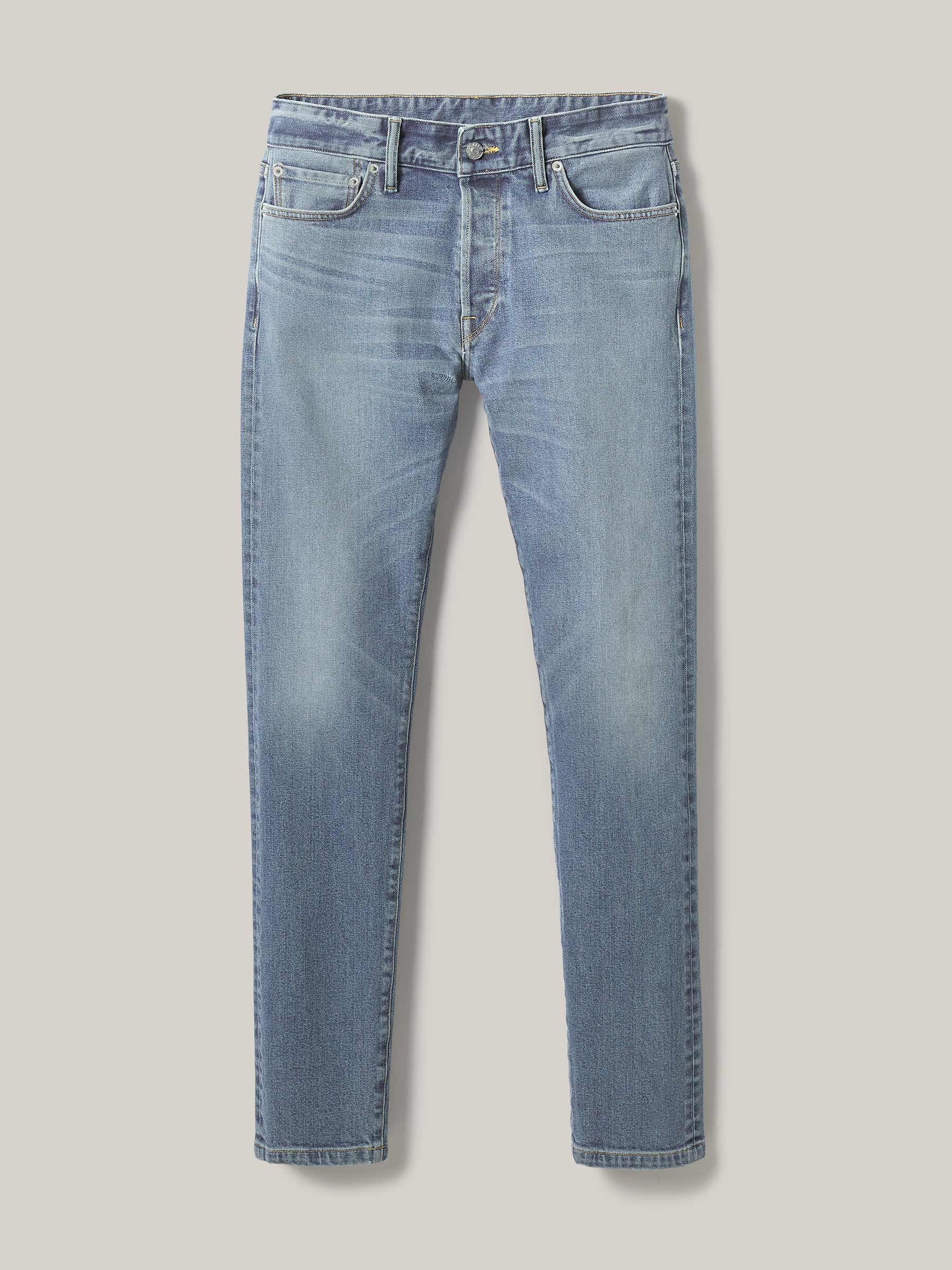 This is the most washed-down jean we make but it’s still got lots of life. This pair comes in a slim cut with a clean, narrow silhouette through the thigh and leg. The quality of a denim “wash” is determined by how realistic the fade looks, the depth of color, and overall softness—in all 3 categories this jean excels. Notice the highs and lows of the indigo around the fly and the subtle ridges along the busted outseam, not to mention the subtle whiskering, honeycomb and stack fades at the hip, knee, and hem. This is as close to an authentic 50 year old jean that you’ll find off the rack.
