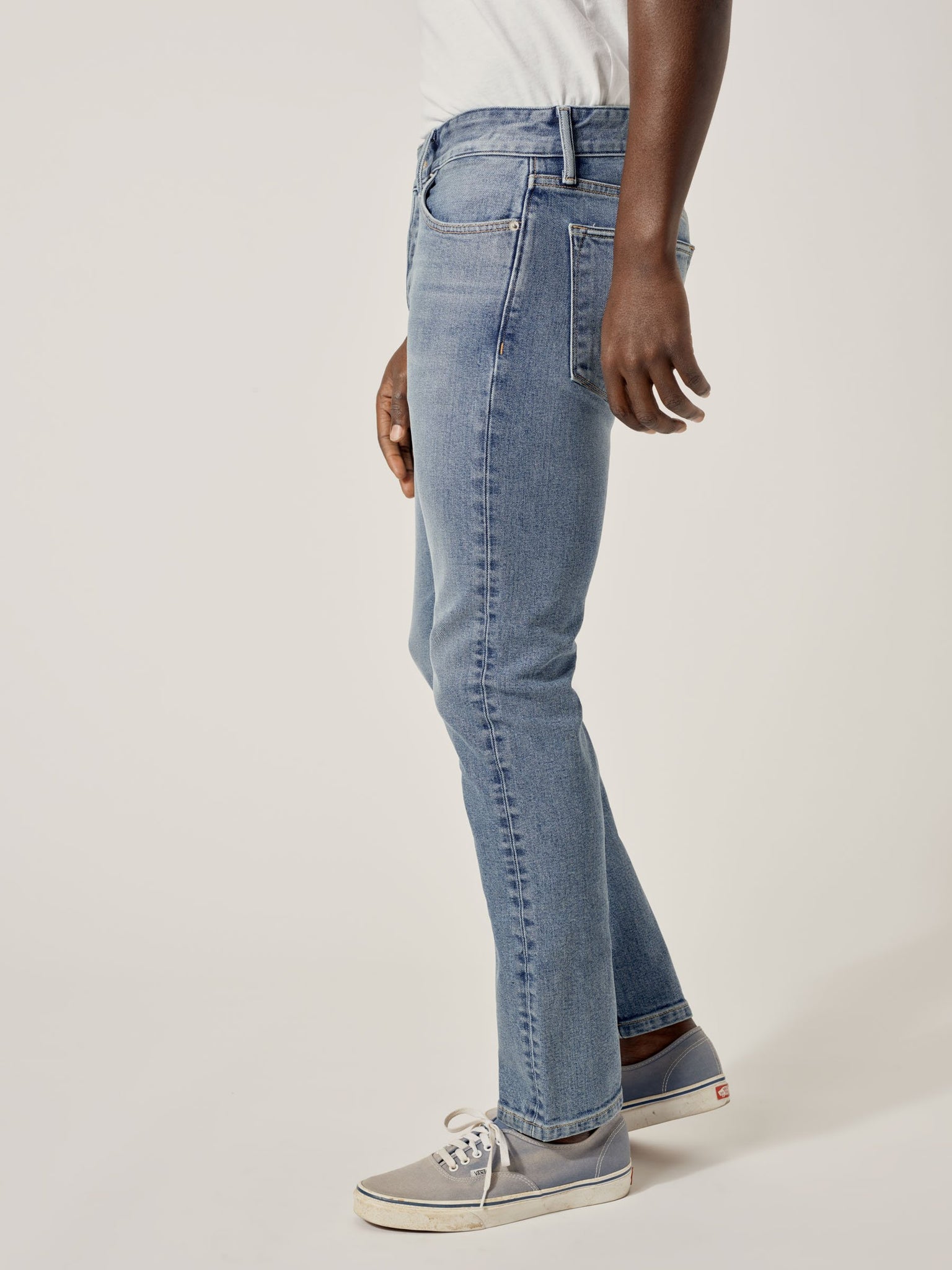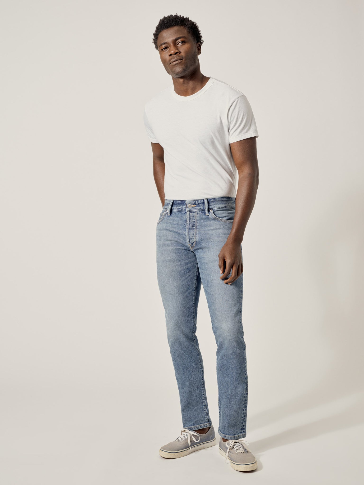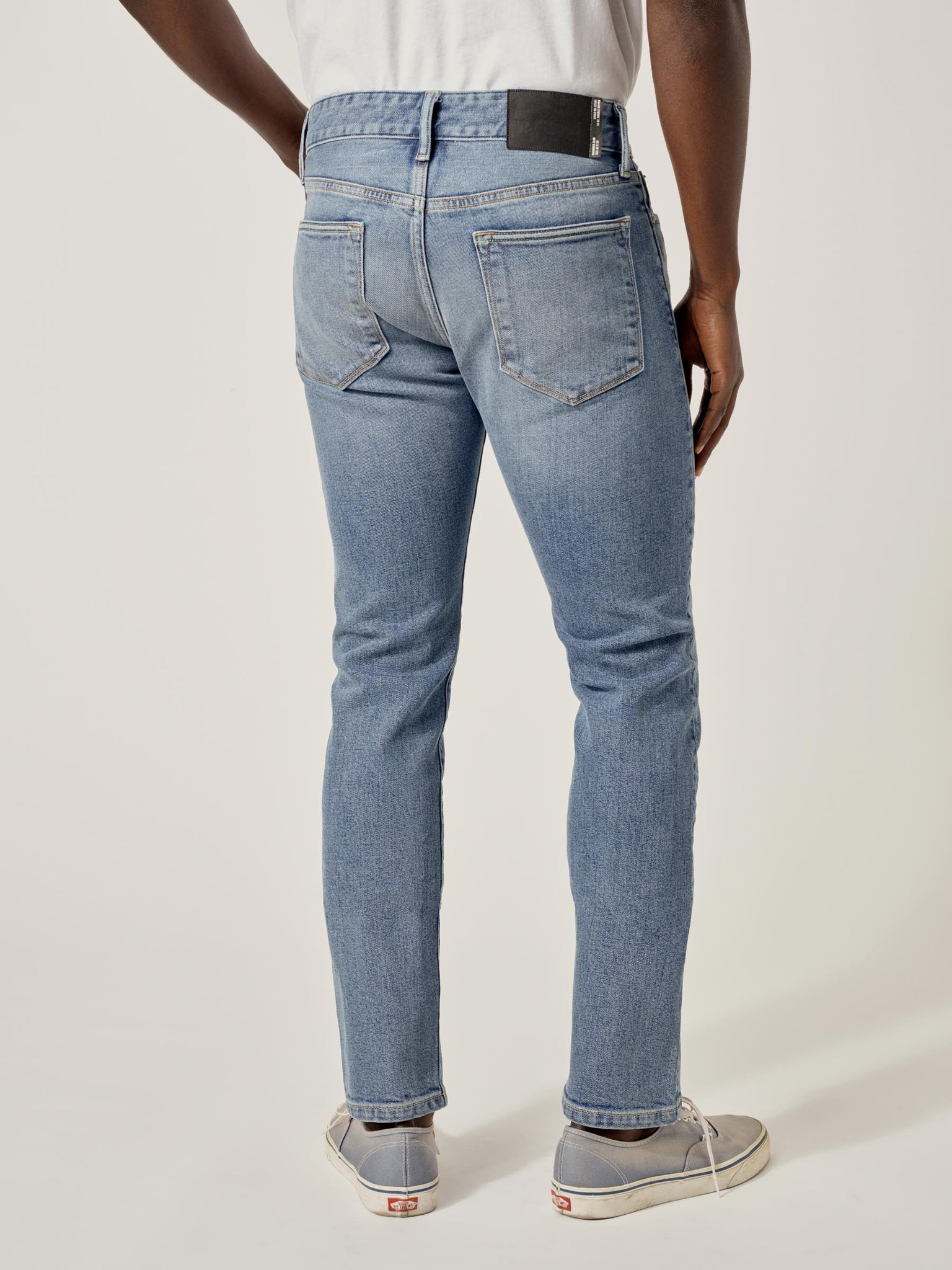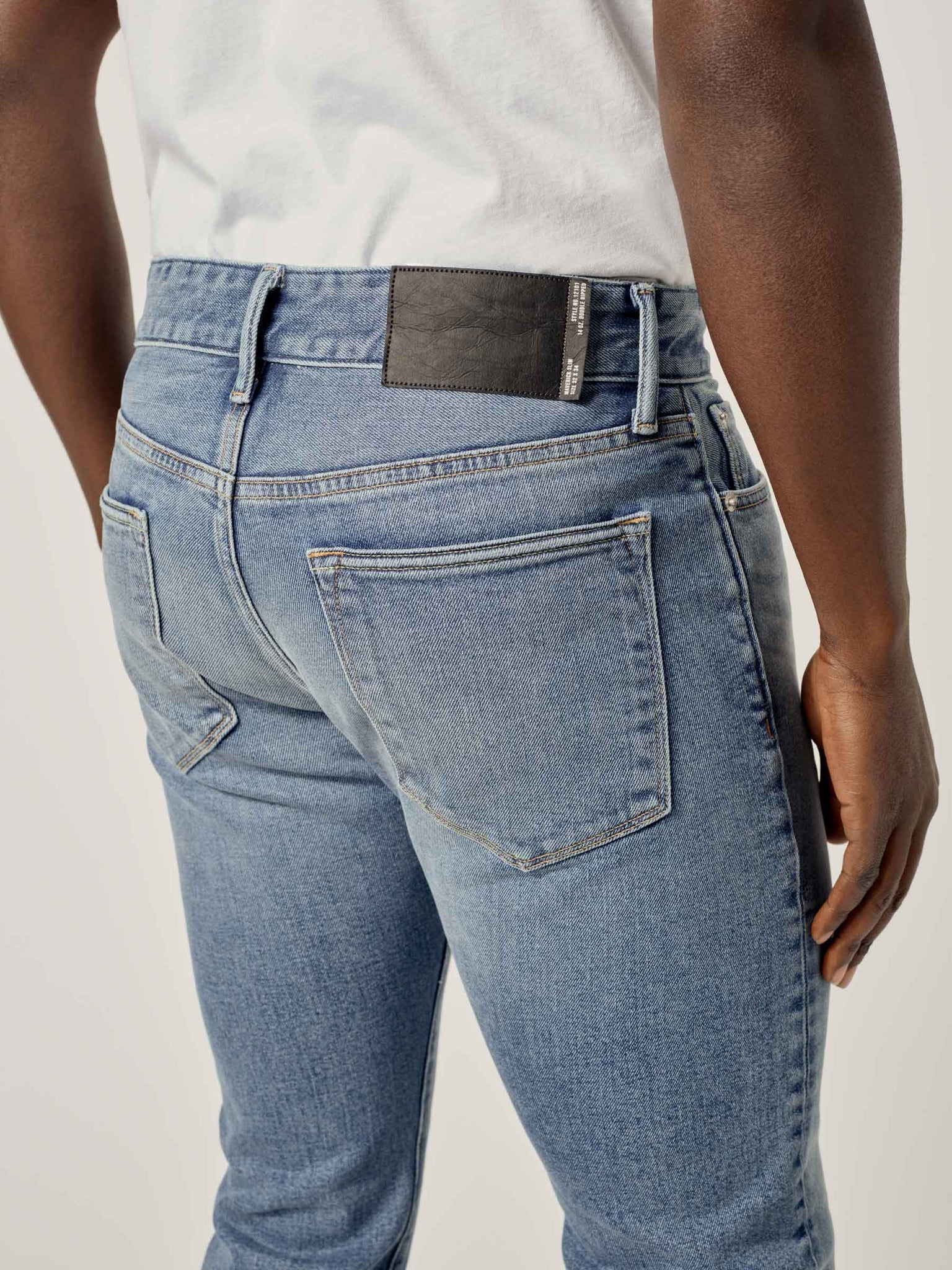 This is the most washed-down jean we make but it’s still got lots of life. This pair comes in a slim cut with a clean, narrow silhouette through the thigh and leg. The quality of a denim “wash” is determined by how realistic the fade looks, the depth of color, and overall softness—in all 3 categories this jean excels. Notice the highs and lows of the indigo around the fly and the subtle ridges along the busted outseam, not to mention the subtle whiskering, honeycomb and stack fades at the hip, knee, and hem. This is as close to an authentic 50 year old jean that you’ll find off the rack.