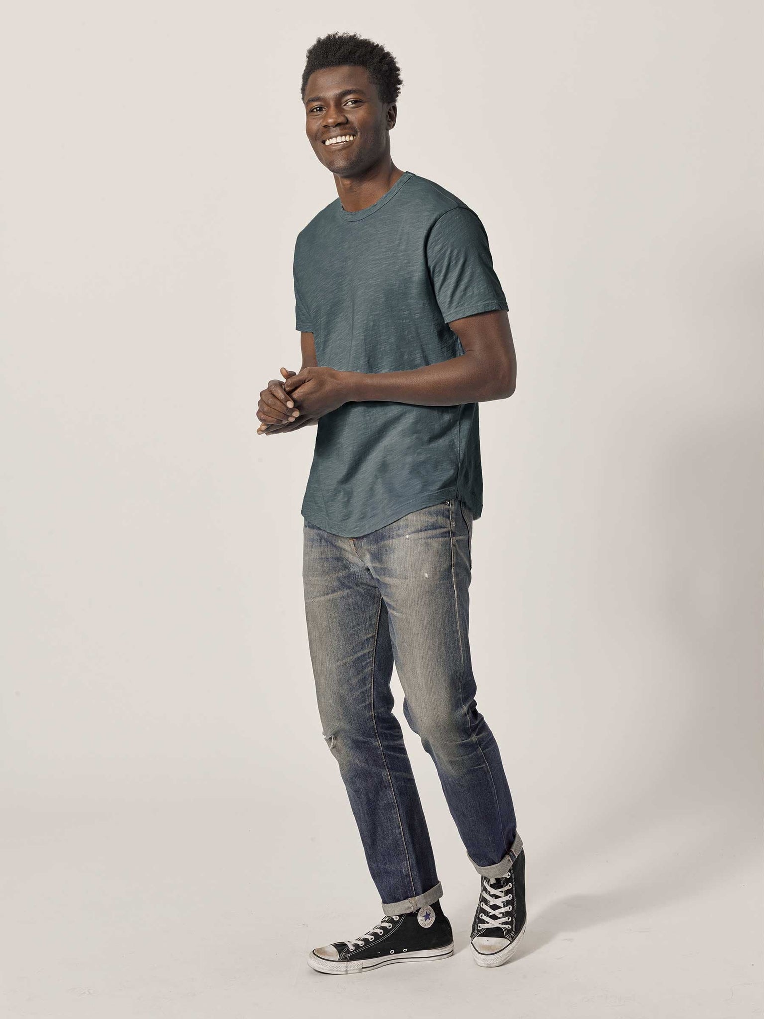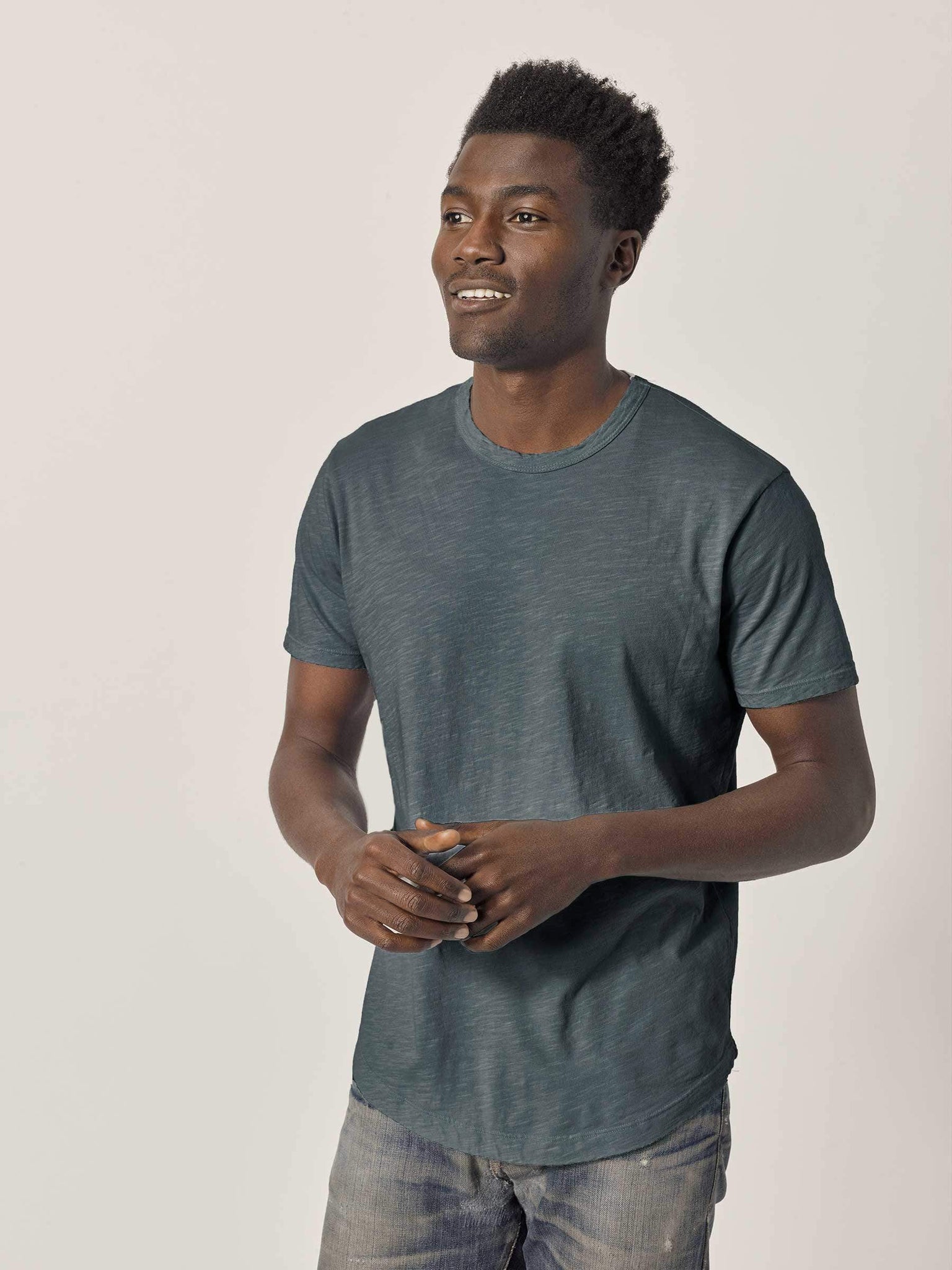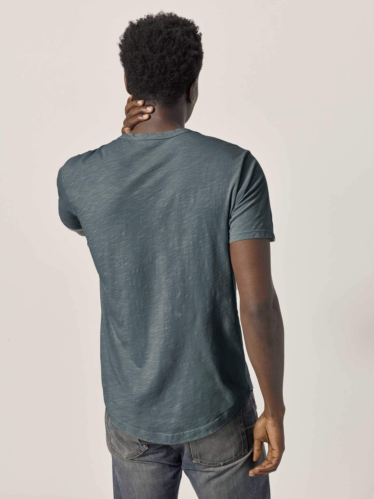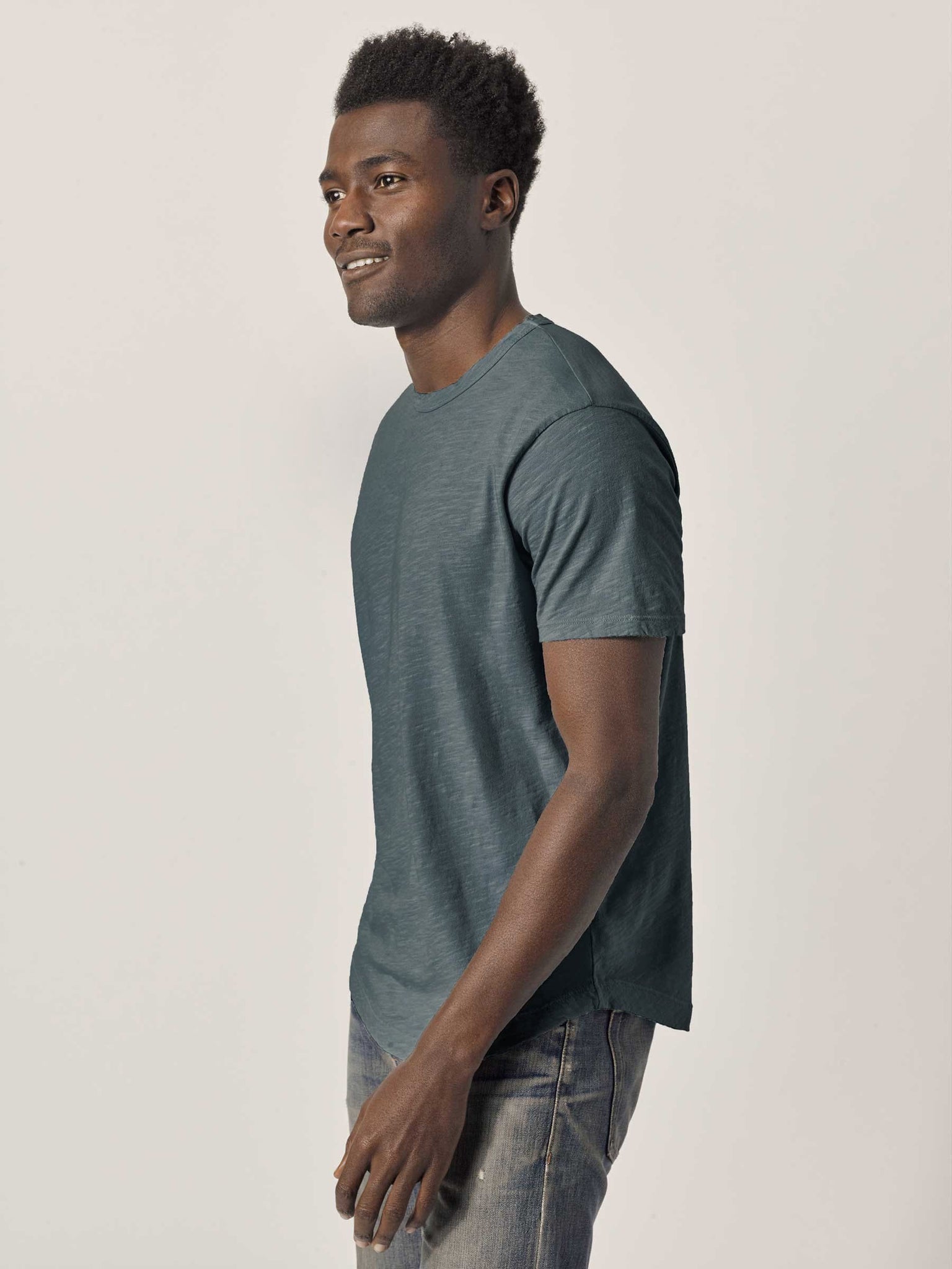 Our slub curved hem tee is built entirely from slub cotton. Slub is lightly textured fabric made on small batch, low-tension looms. Our Venice Wash targets cellulose fibers in cotton, resulting in unparalleled softness and incredible drape. The rounded shirttail lends a tailored look to an everyday essential.