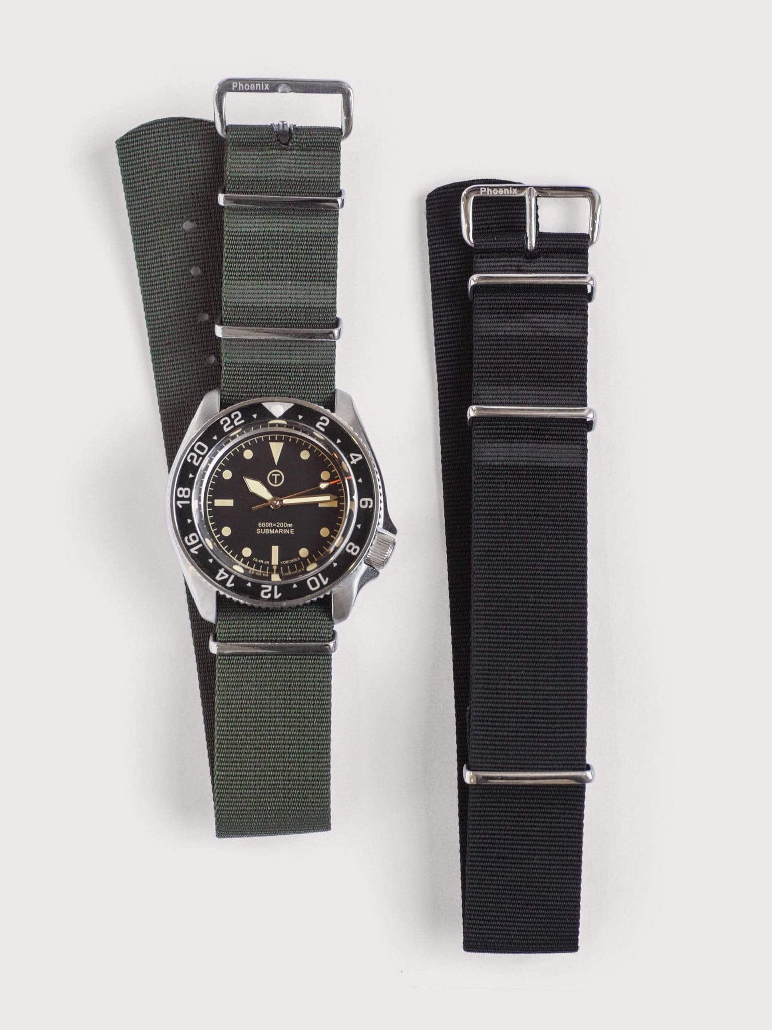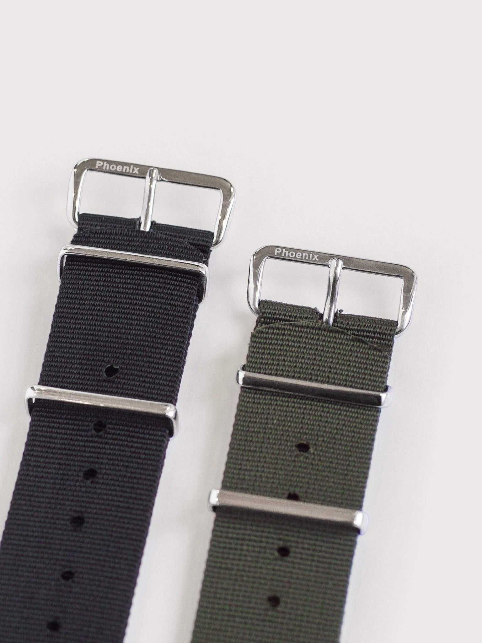- Band: Phoenix G10 NATO nylon strap in Black and Military Green
