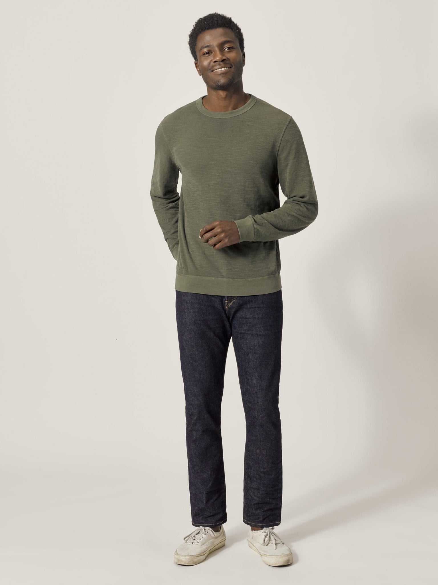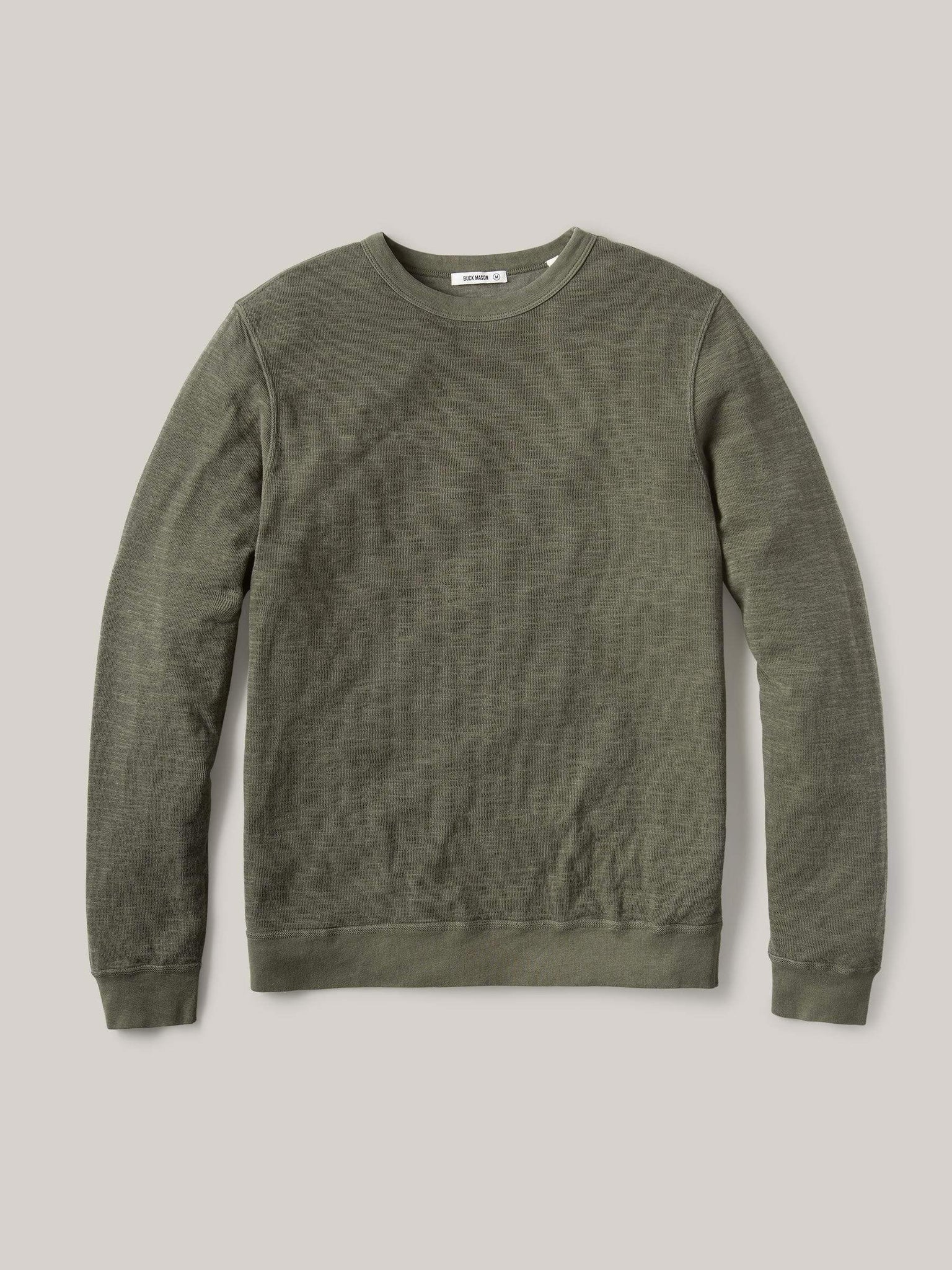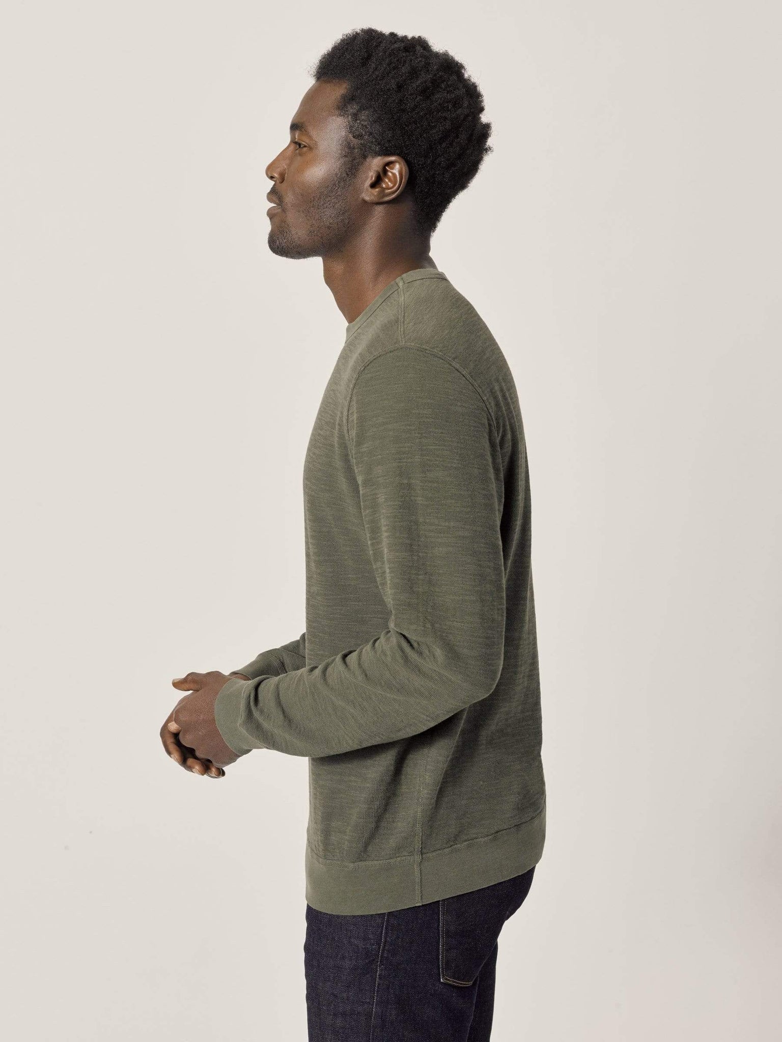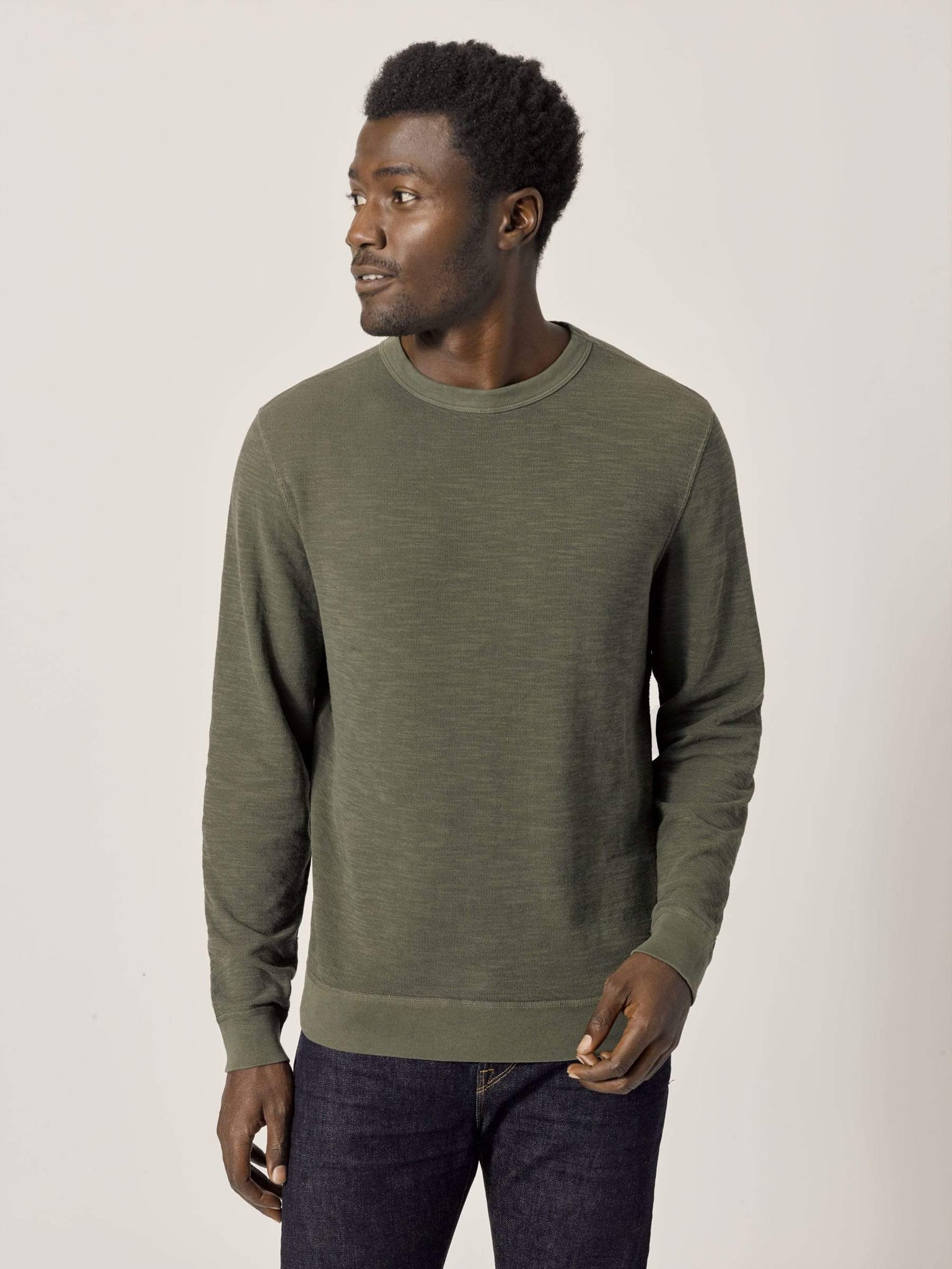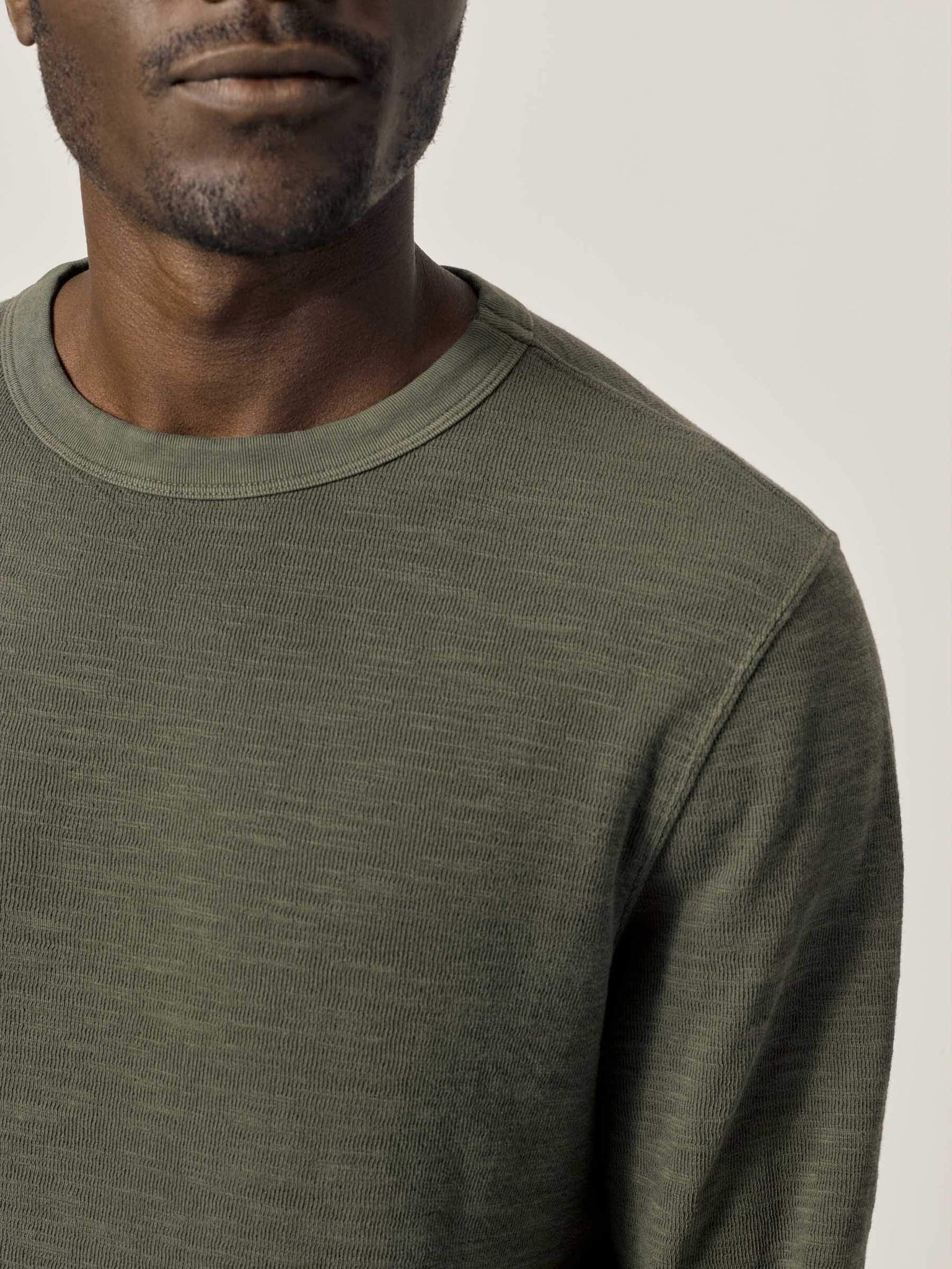 A loose long-sleeve sweatshirt cut from textured cotton. On the inside is a silky, brushed micro-jersey, and on the outside, a beefy slub cotton. The space between them traps heat and circulates warm air without overheating. The cut is modeled on an old-school crew sweatshirt that we dip-dyed in vintage colors.