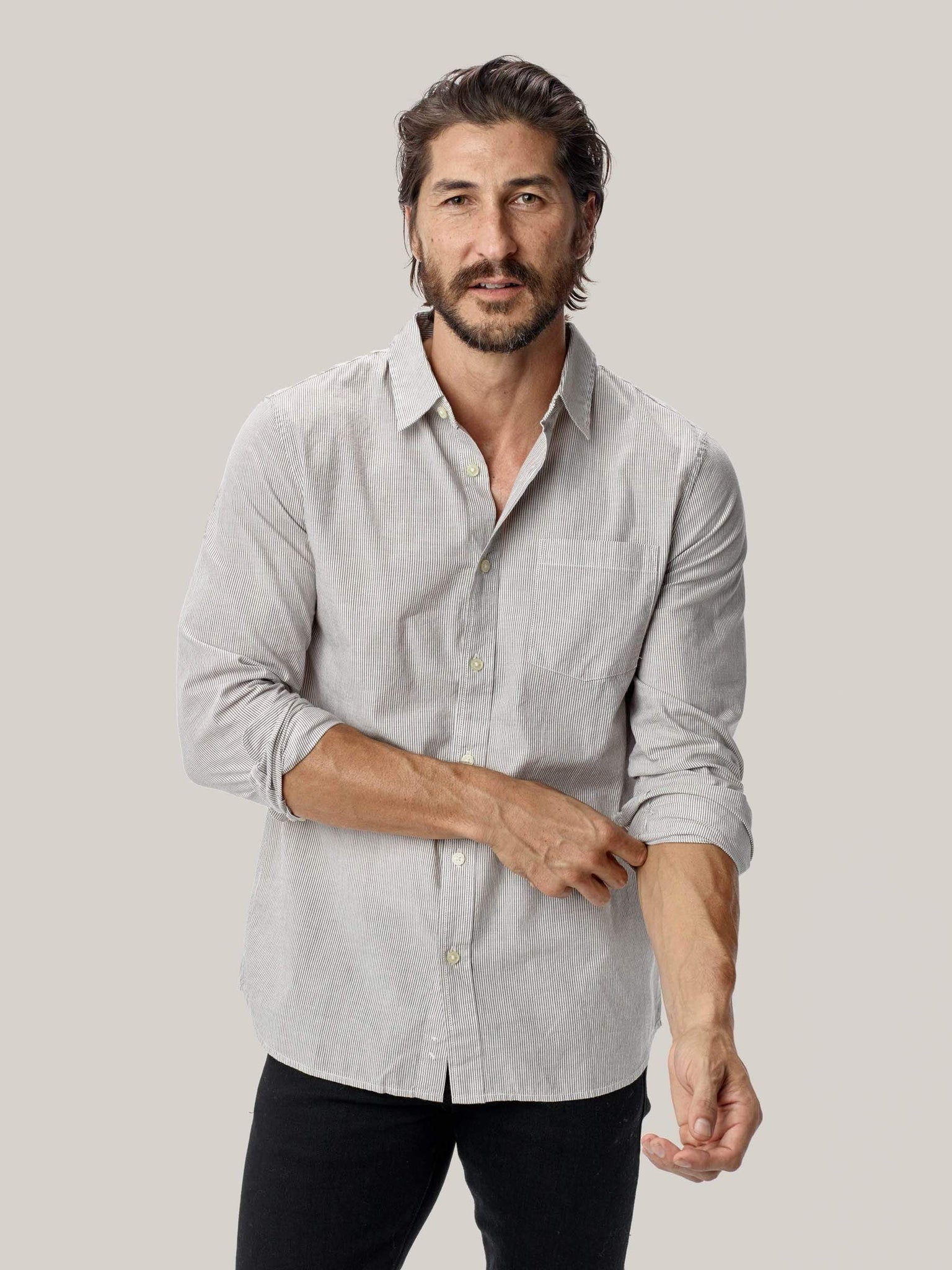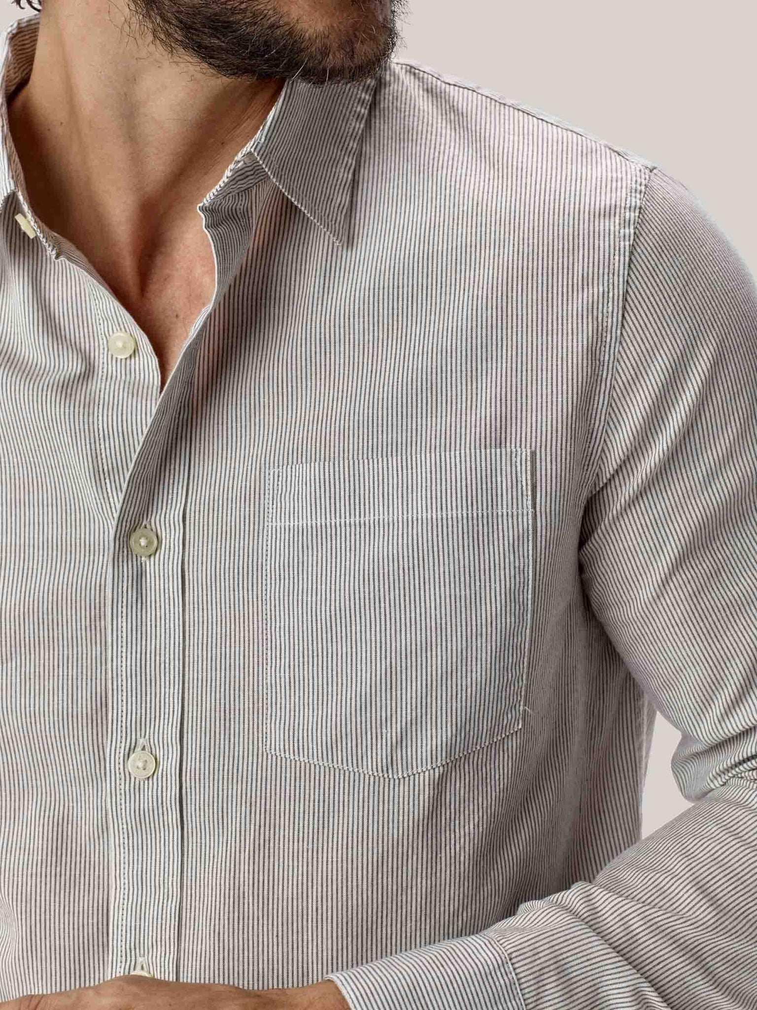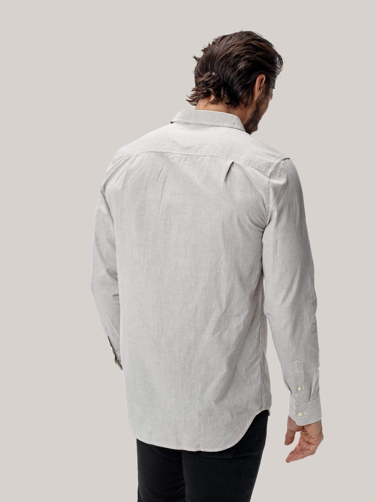 Old world manufacturing meets modern design. The fabric for our Rinsed Fine Stripe was made at a Japanese mill that’s been continuously operating for 200 years. Our pattern makers and sewers ensure all the stripes line up cleanly on the pocket and placket, and we placed darts at the shoulder for a clean silhouette with maximum mobility.