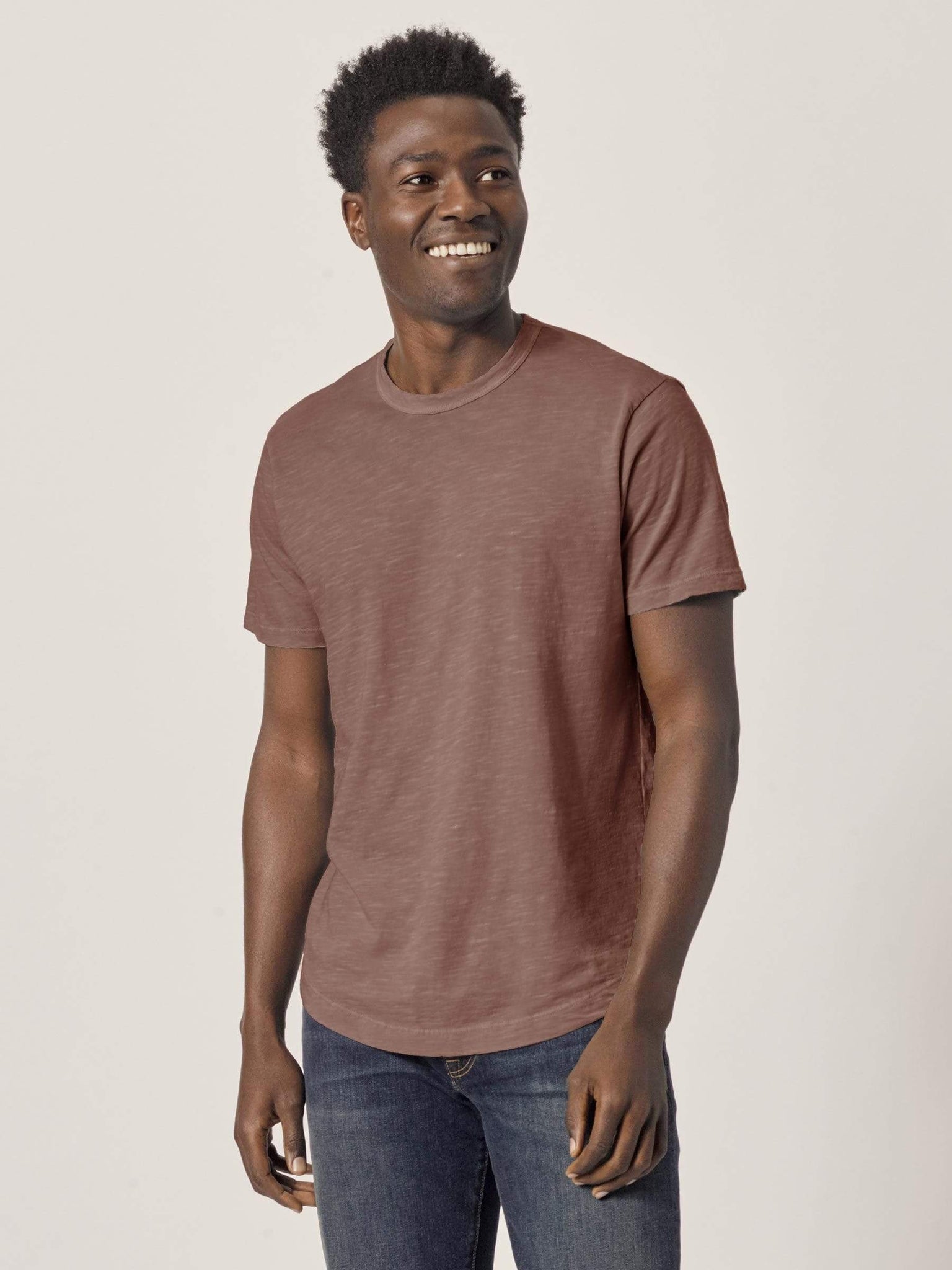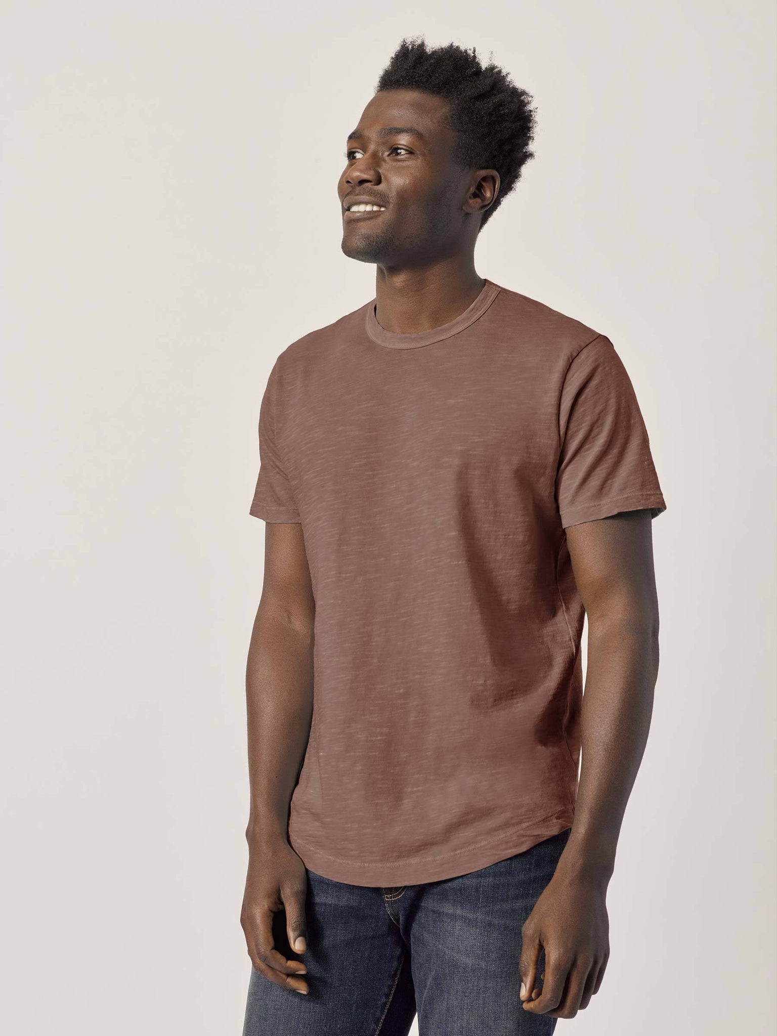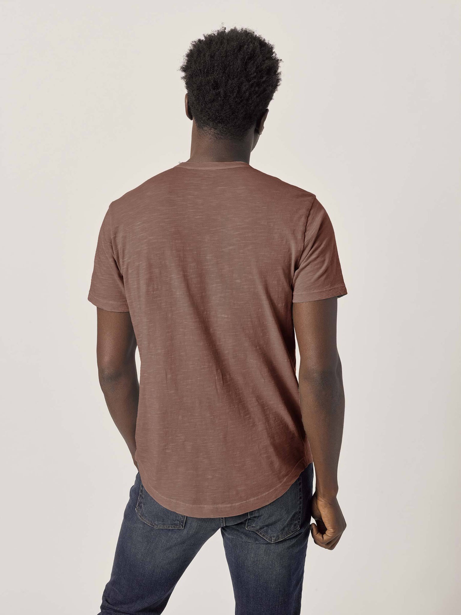 Our slub curved hem tee is built entirely from slub cotton. Slub is lightly textured fabric made on small batch, low-tension looms. Our Venice Wash targets cellulose fibers in cotton, resulting in unparalleled softness and incredible drape. The rounded shirttail lends a tailored look to an everyday essential.