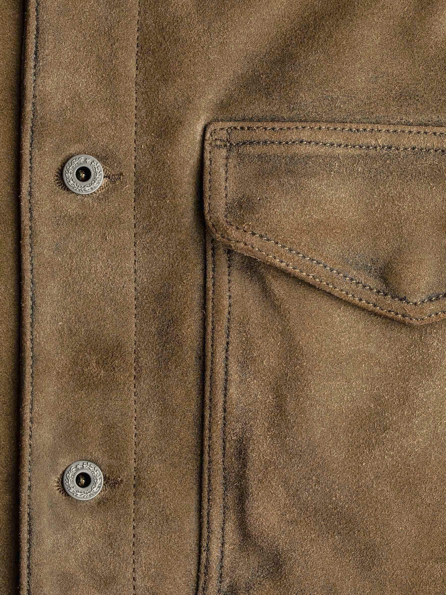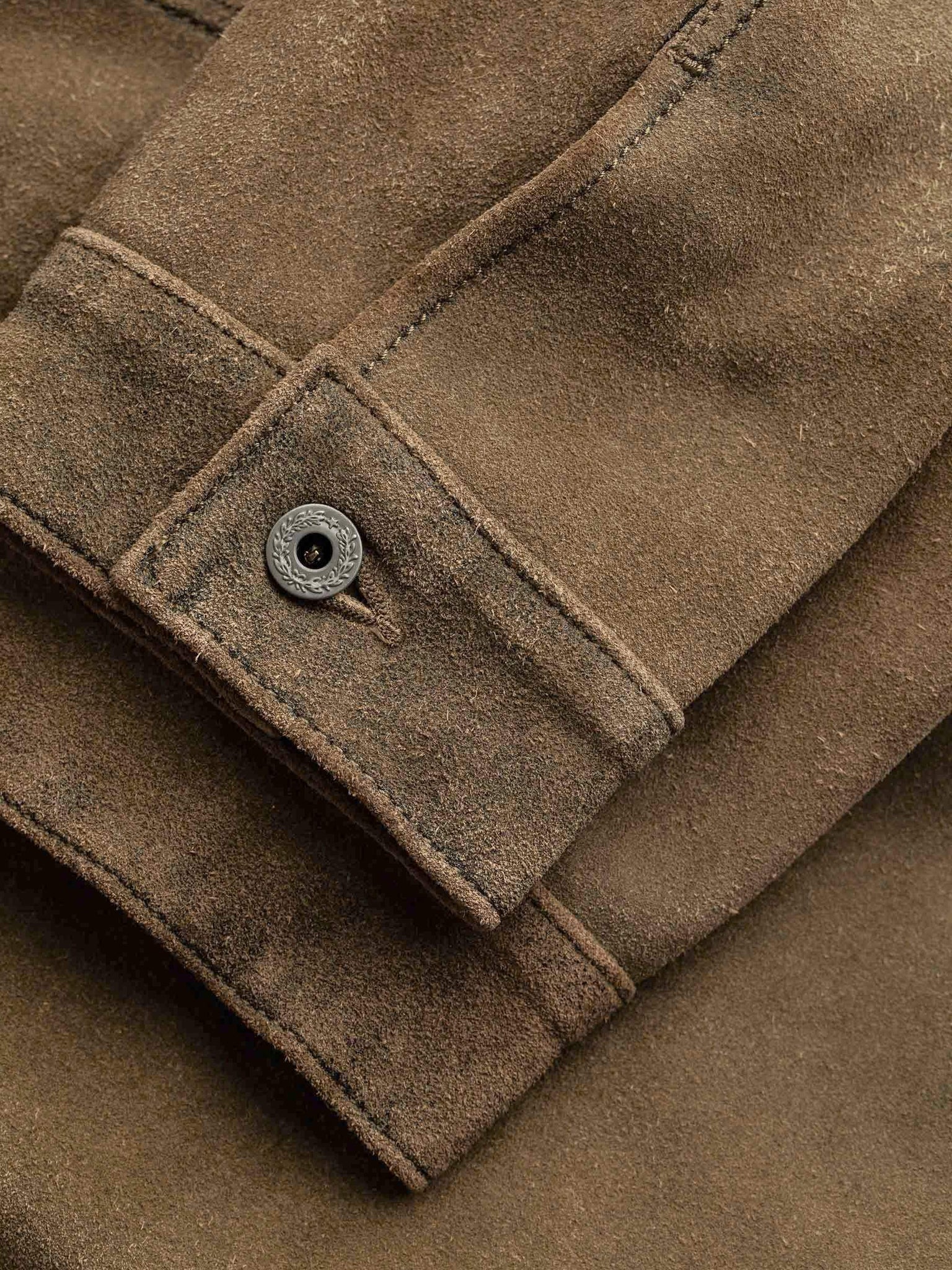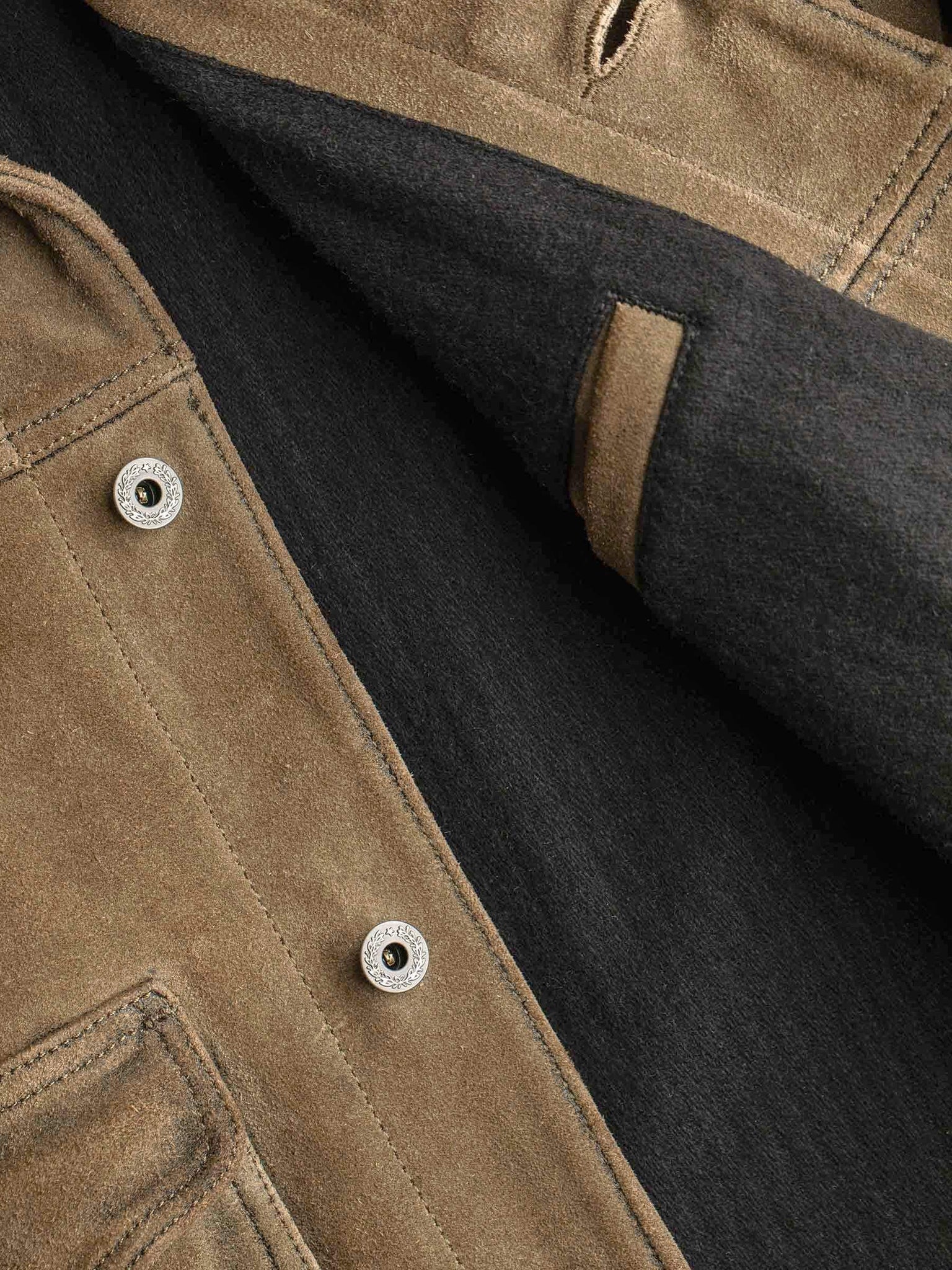 A fully-lined trucker jacket cut from soft, sueded leather. The hide is sanded down then tumbled to really bring out that worn-in, vintage feel. The fit is modeled after a slightly cropped trucker jacket. Details include large hip flap pockets with top and side entry, tab waistbands, a wool-blend body lining, and vintage-inspired hardware. This trucker offers the look and structure of a vintage suede jacket, but with a lot less bulk.